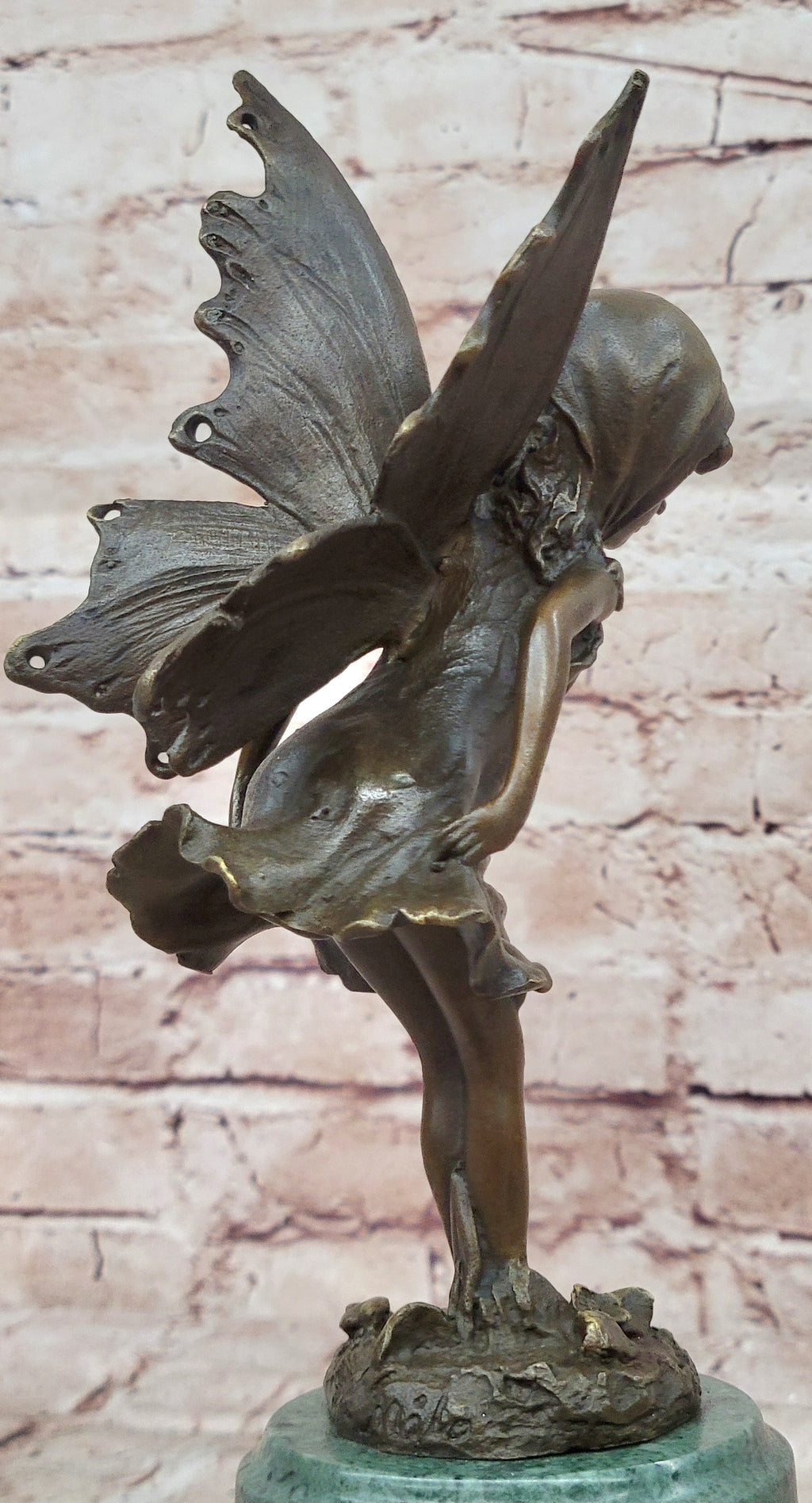 With delicate fairy wings arching behind her, the sculpture embodies the essence of fantasy and dreams. Her attire, a brown patina hooded dress, adds to the enchanting aura, making her a perfect addition to any little girl's room. Crafted from 100% bronze and meticulously handmade using the "Lost Wax Method," this sculpture reflects the artist's dedication to detail and artistry. Mounted on a marble base and signed by Milo, this exquisite piece is not just a decoration but a timeless expression of childhood wonder and imagination.