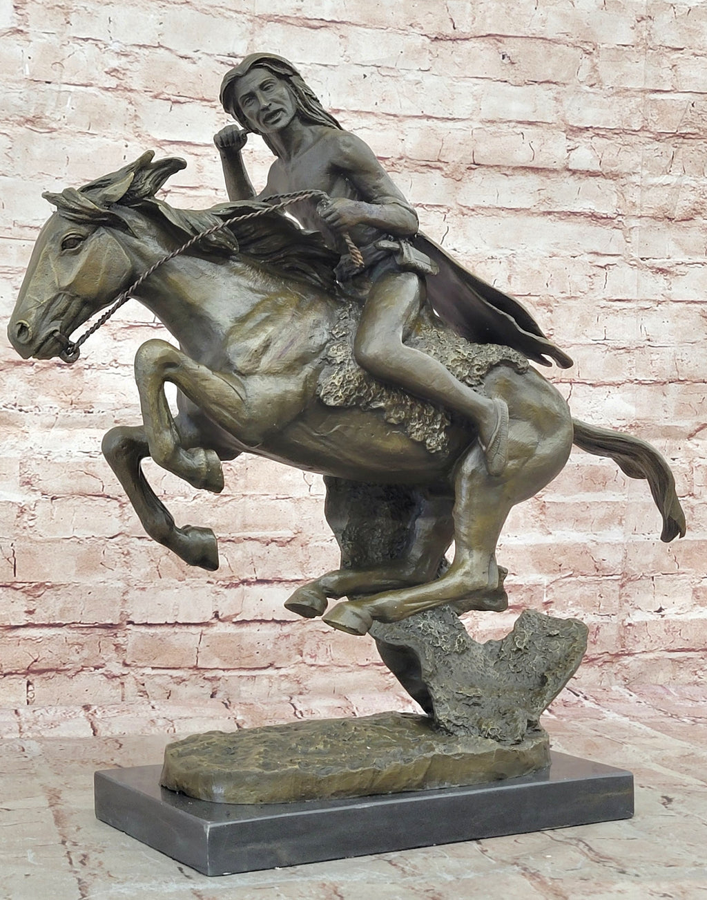 Mounted on a sleek black marble base, the sculpture radiates sophistication and strength. Signed by the renowned artist Frederic Remington, this piece not only celebrates the raw intensity of the moment but also serves as a poignant homage to the cultural heritage it represents. Whether displayed in a private collection, rustic interior, or executive space, it stands as a powerful symbol of the unbreakable bond between human and horse—and of the spirit that rides forever across history’s open plains.