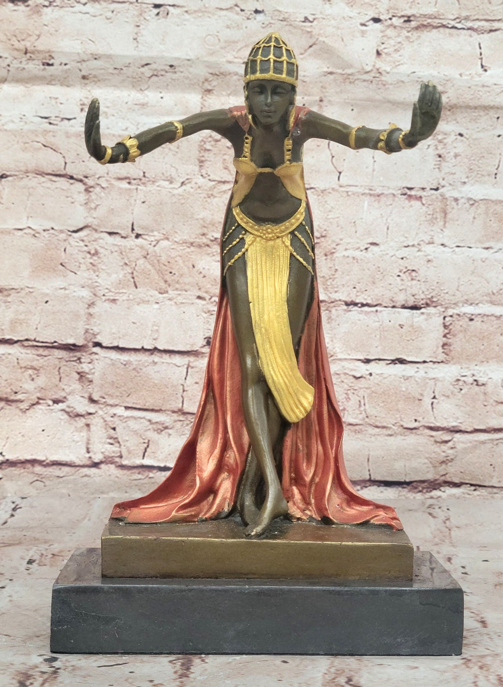 Crafted using the ancient "Lost Wax Method," this sculpture not only preserves the princess's physical form but also immortalizes her traditional dance. The rich brown and gold patina adds depth and warmth to the piece, enhancing its regal charm. Mounted on a sleek black beveled marble base with a multi-color patina and bearing the artist's signature, Colinet, this sculpture is a true masterpiece that brings the elegance and allure of ancient Egypt to life in your space. It's a perfect addition for art connoisseurs and enthusiasts alike, offering a glimpse into the timeless beauty of Egyptian culture.