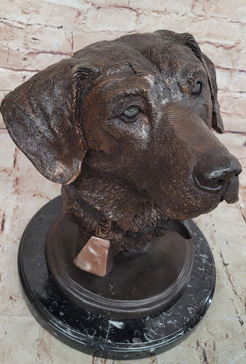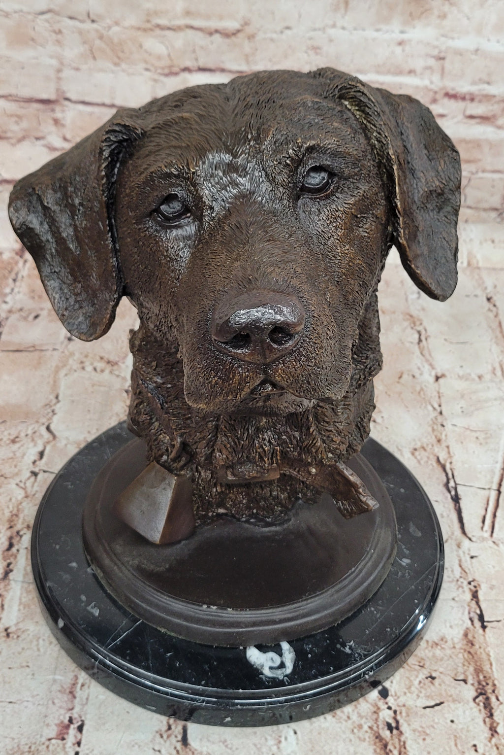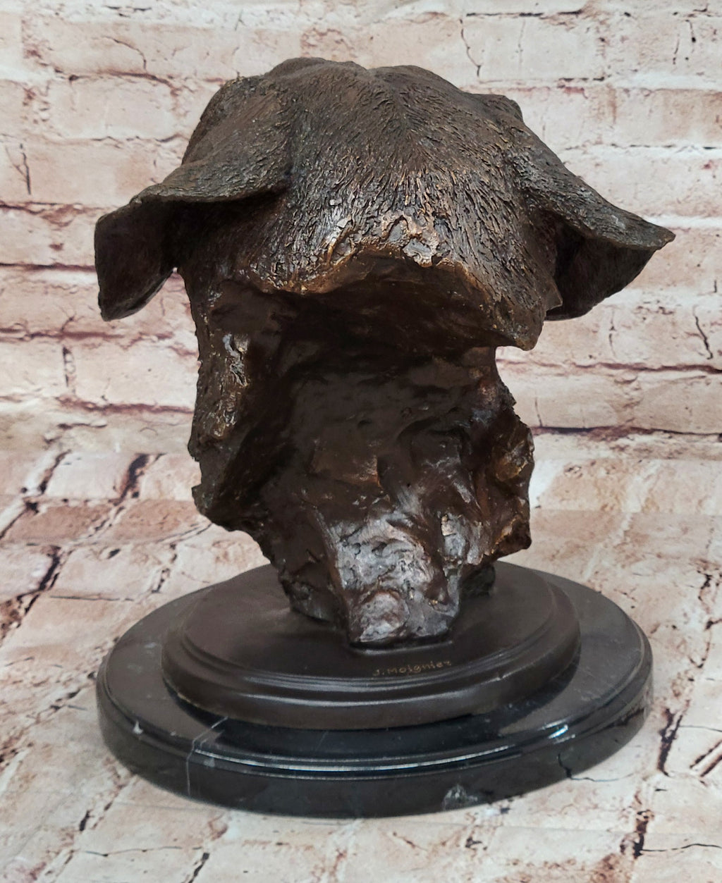 The sculpture's two-tone brown patina finish adds depth and dimension to the piece, enhancing the lifelike quality of the dog's portrayal. Mounted atop a sleek black marble base, this artwork stands as a testament to the skill of the artist Moigniez. By proudly displaying this retriever bust, you invite the joyful and gentle spirit of these wonderful dogs into your space, creating a heartwarming focal point that resonates with dog lovers and art enthusiasts alike.