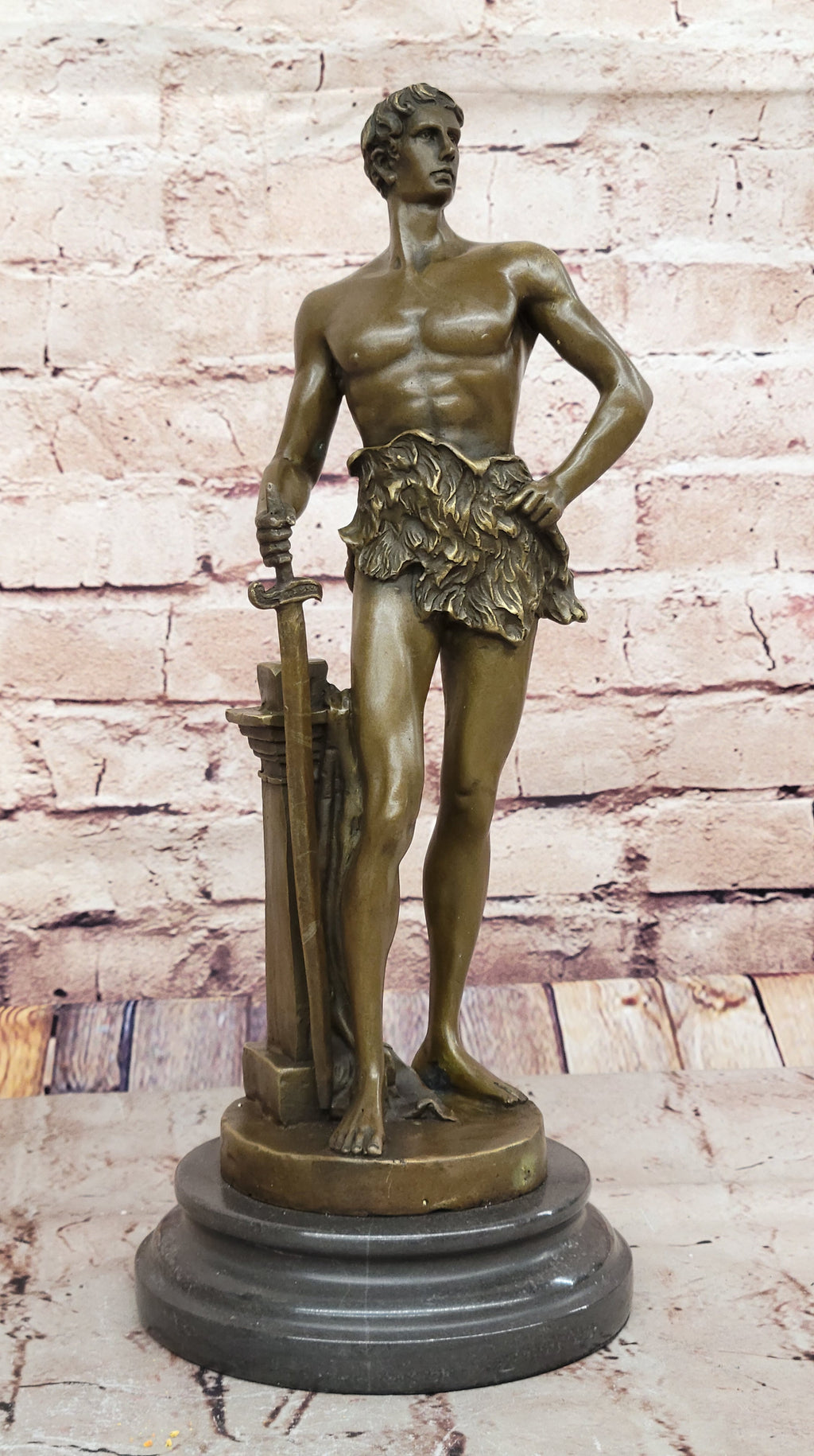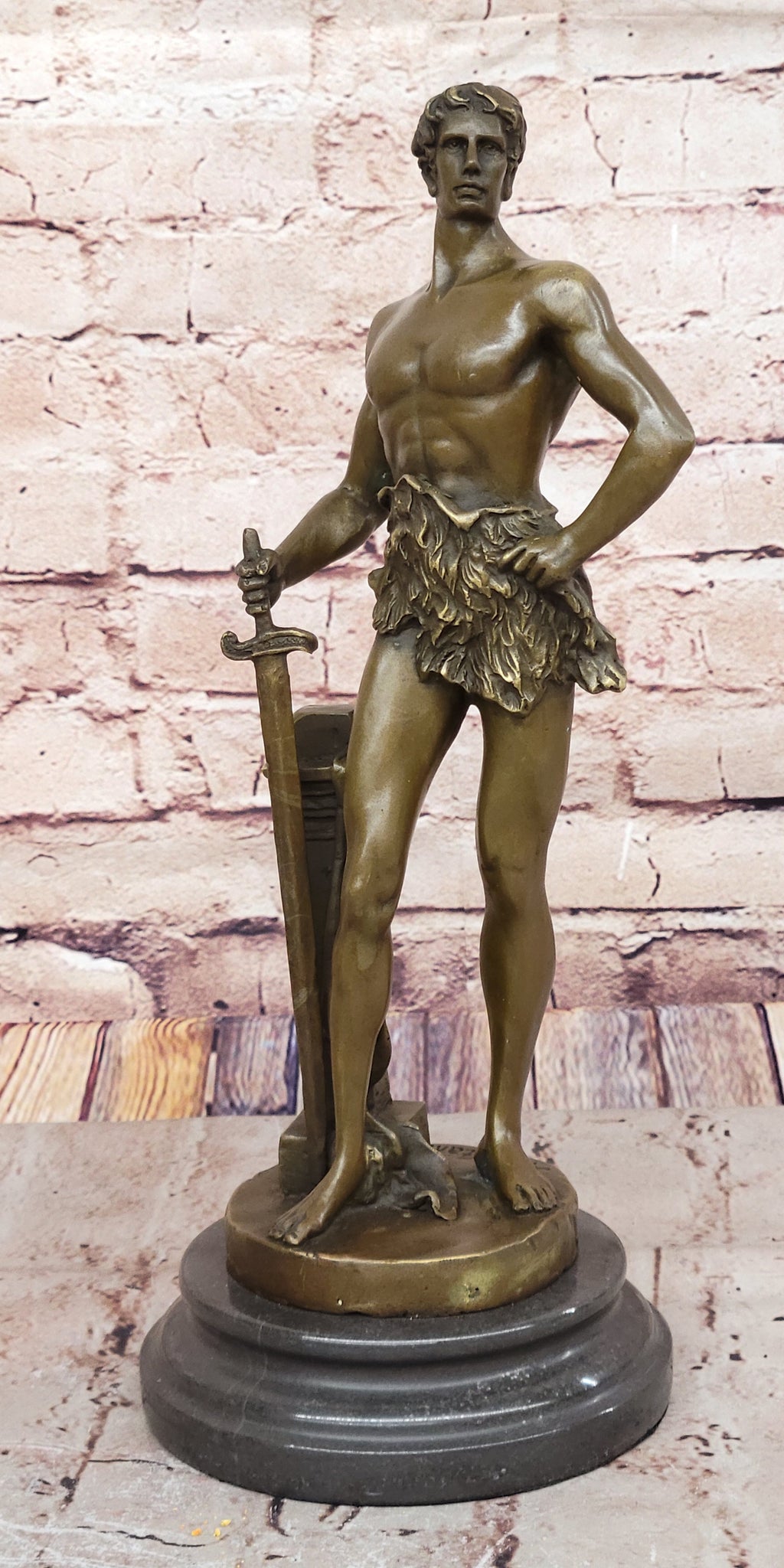 Crafted using the ancient lost-wax casting method, the sculpture showcases meticulous attention to detail and craftsmanship. Each element, from the man's muscular physique to the intricate design of the sword, is rendered with precision and skill. The brown patina finish adds depth and richness to the bronze, enhancing its visual appeal and ensuring its durability over time.