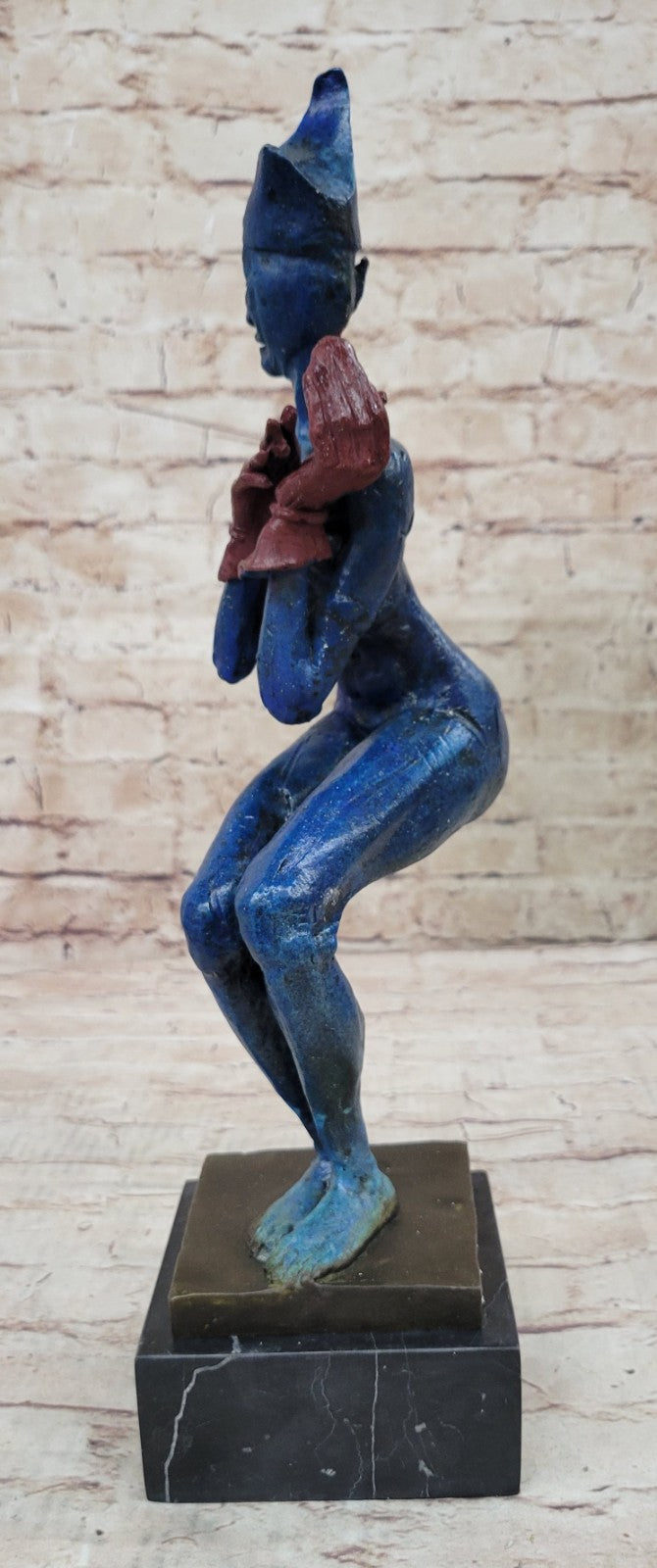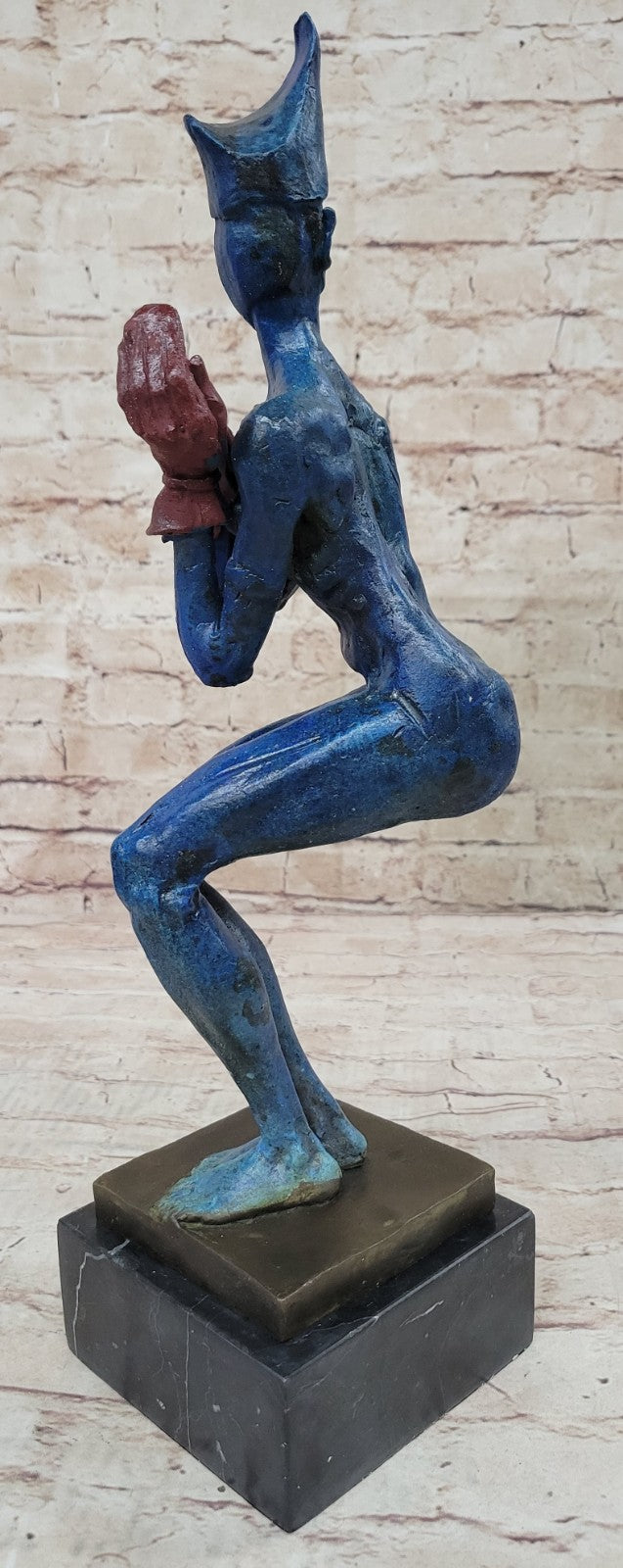 What truly sets this piece apart is its stunning multi-color patina. Rich shades of brown provide depth and classical warmth, while tasteful accents of blue and red bring vibrance and personality to the jester’s costume. This dynamic coloring adds a painterly quality to the sculpture, enhancing its overall visual appeal and giving it a sense of individuality. The combination of color and form results in a captivating work that can brighten any room, whether displayed in a home, gallery, or office.