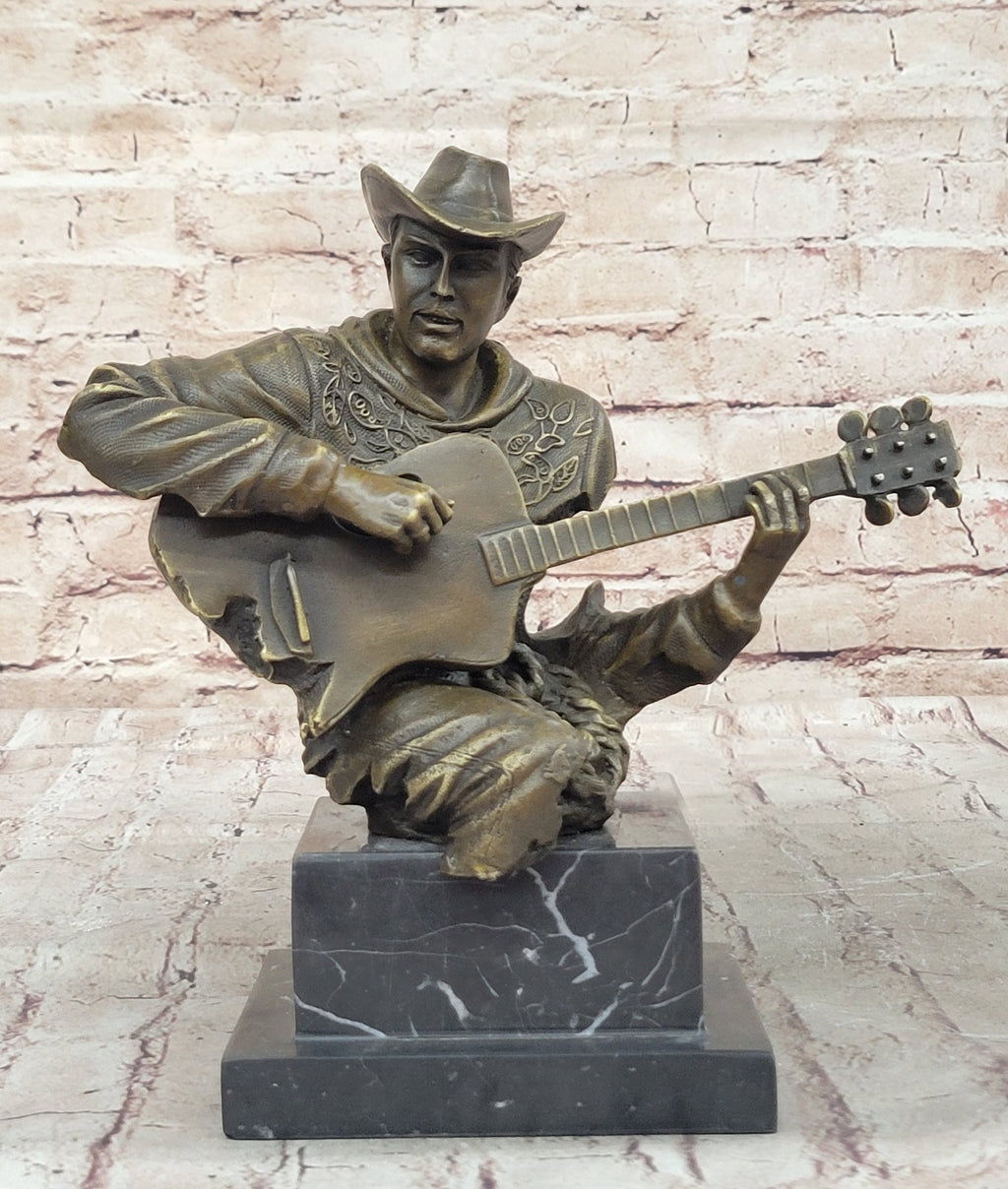 Bring the spirit of the Old West into your home or collection with this stunning bronze sculpture of a cowboy playing guitar. Every detail captures the cowboy’s passion and concentration as he strums, making it a lifelike tribute to Western charm and musical artistry.