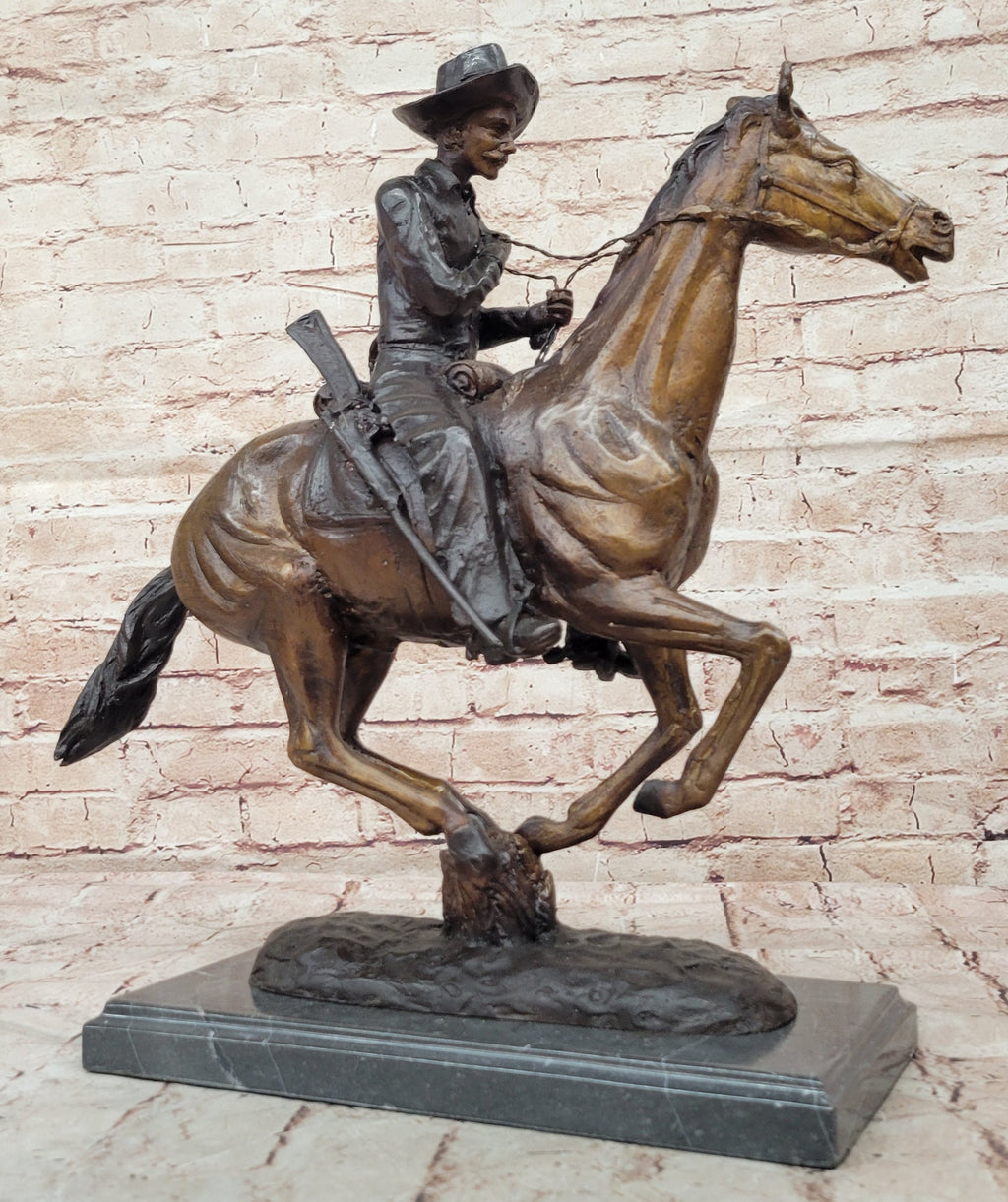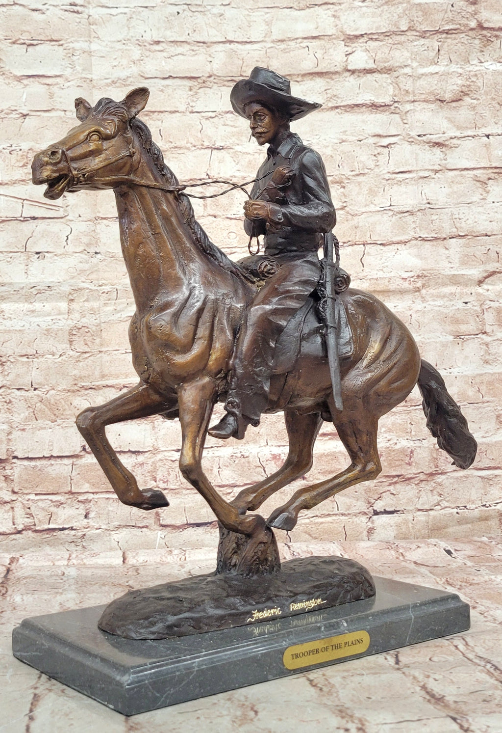Crafted using the revered lost-wax method, this sculpture exemplifies Remington's mastery in capturing the intricate details of the scene. The trooper, mounted on his trusty steed, exudes a sense of strength and determination as they navigate the expansive plains. Every nuance, from the trooper's attire to the horse's muscular form, has been meticulously rendered in bronze.