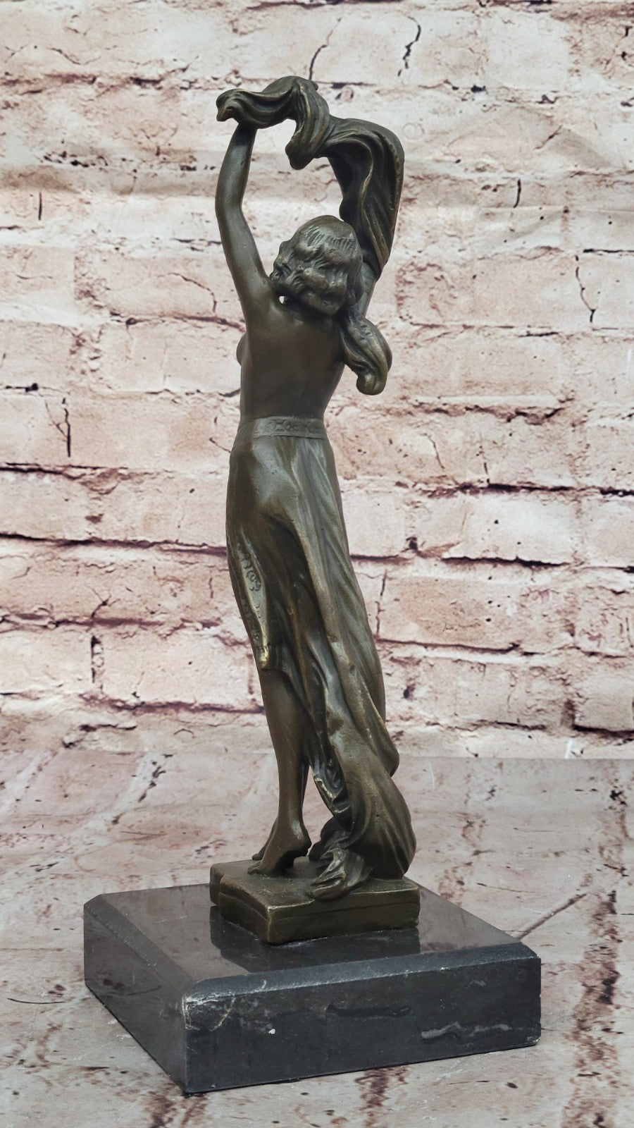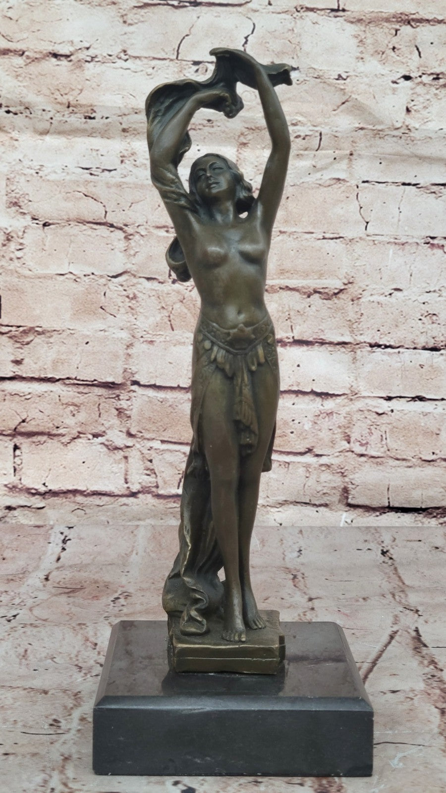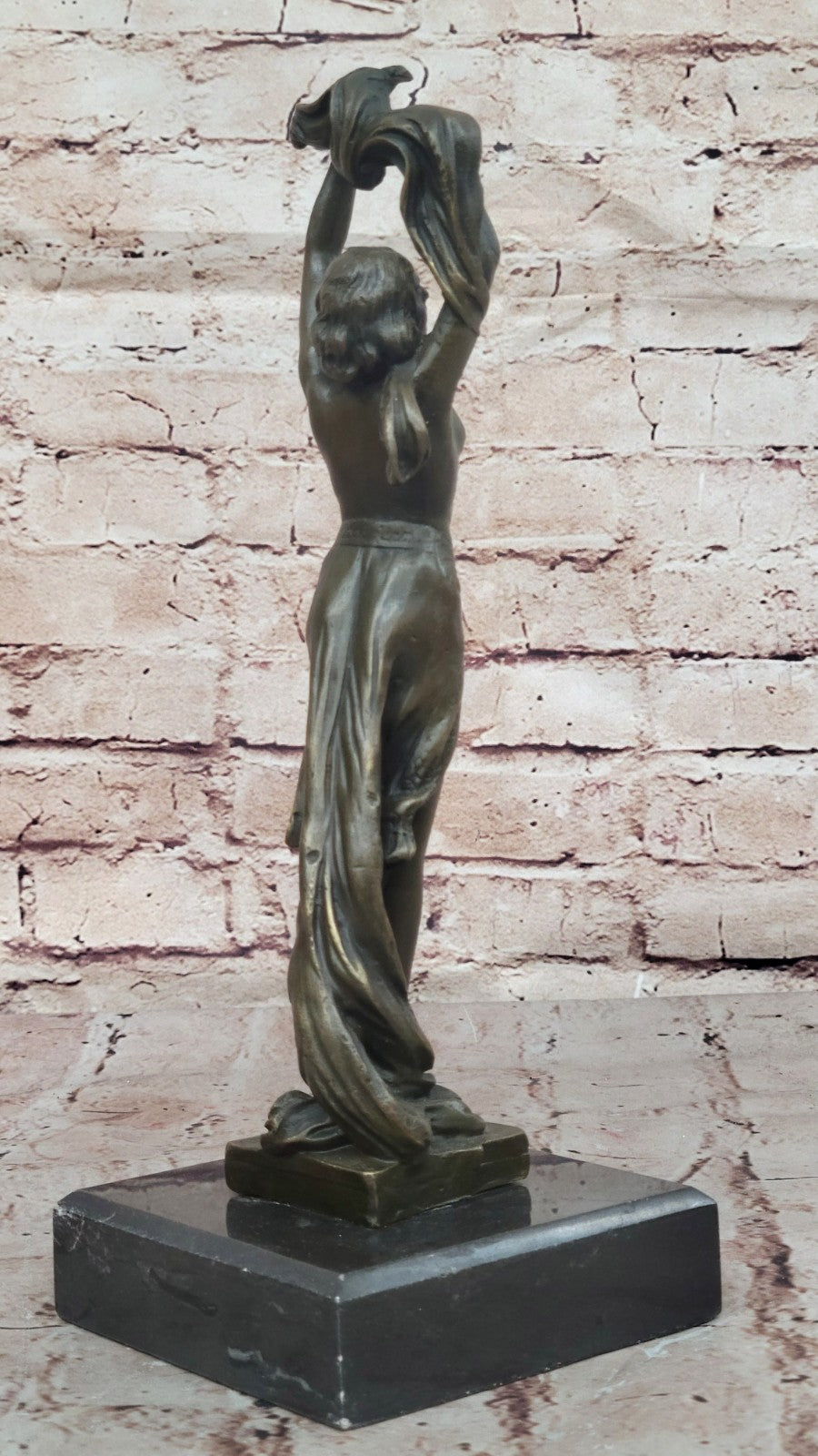 This Art Nouveau sculpture exudes ease and composure, capturing the viewer's attention with its graceful design and impeccable execution. The centerpiece is a poised woman, standing with both arms elegantly raised above her head, embodying a serene yet powerful presence. Her jeweled two-piece garment is intricately detailed, showcasing the artist's meticulous craftsmanship. Her focused gaze, directed at an unseen point ahead, radiates confidence and concentration, adding depth to her regal pose. The decorative headpiece further enhances her air of authority and grace, making this piece a truly marvelous work of art.