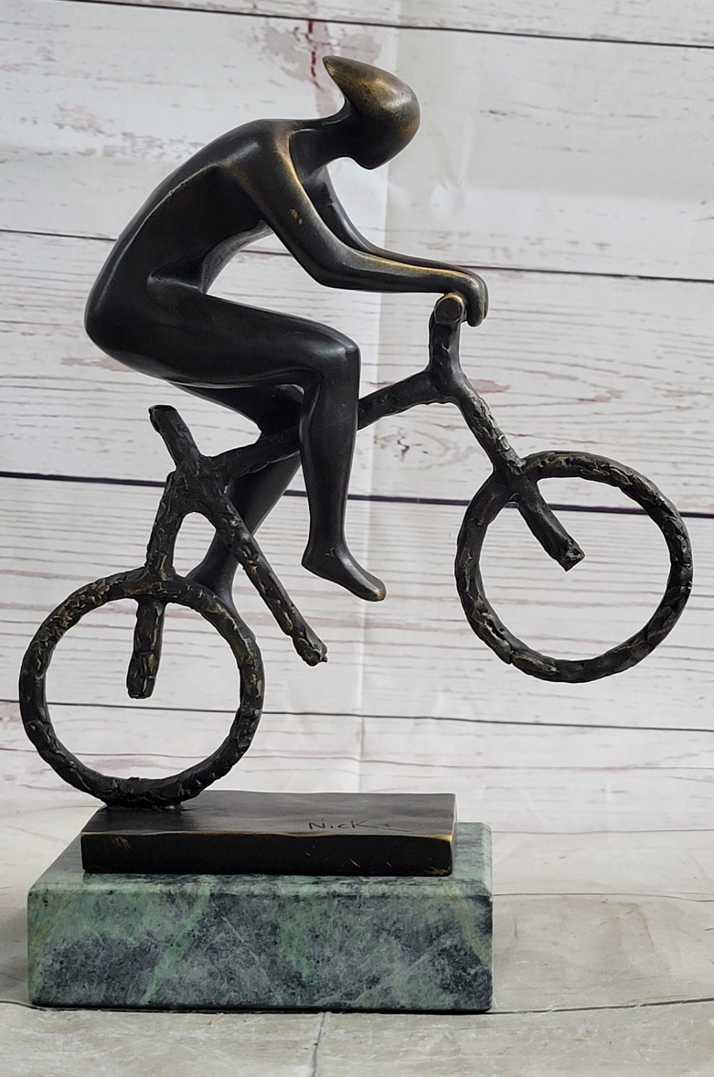 Mounted on a sleek green marble base, the bronze cyclist stands as a timeless tribute to the art of athleticism and endurance. Signed by the artist Mario Nick, this sculpture is a unique and powerful addition to any collection, honoring both the human body and the passion for sport.