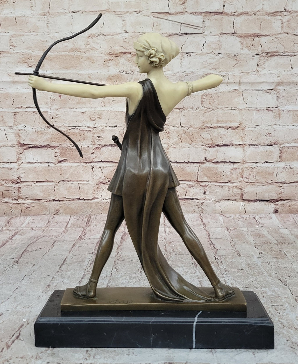 In this sculpture, Diana is depicted in her iconic role, armed with her crossbow as she takes aim at her target. Her posture exudes strength and determination, with her legs firmly locked and her body poised in perfect hunter's form. With her sword slung around her hip, she embodies both grace and power, symbolizing the ideals of beauty, strength, and chastity that have made her a revered figure throughout history.