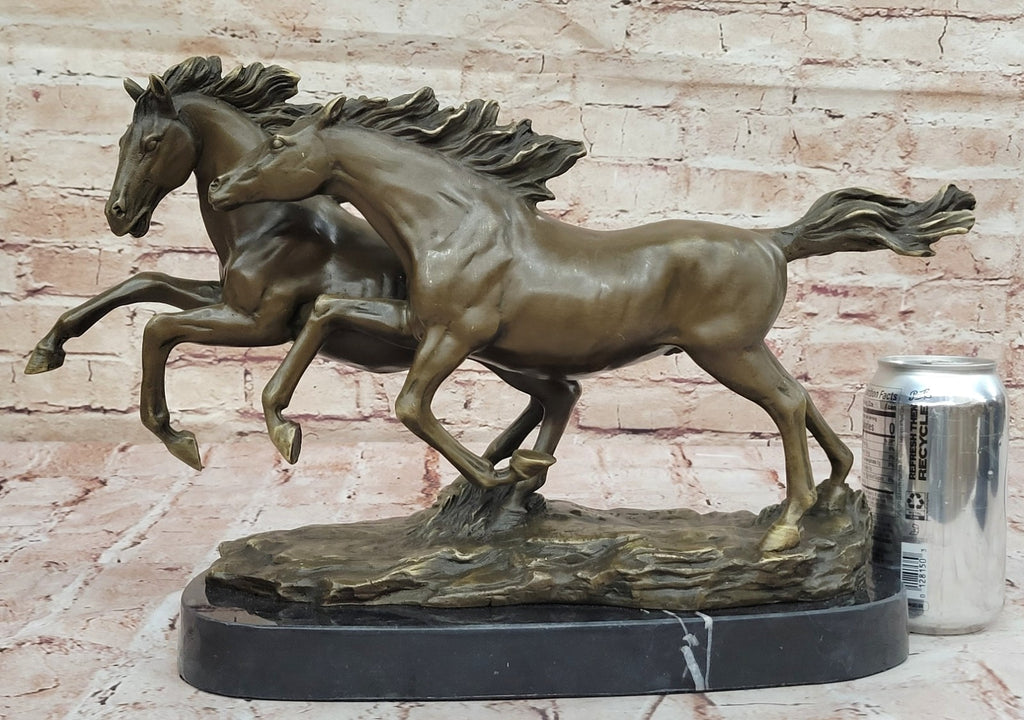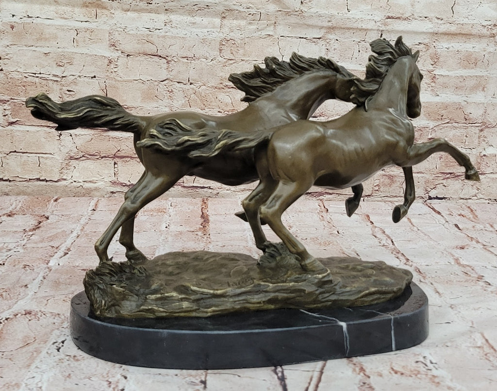 This breathtaking bronze sculpture perfectly captures the raw energy and untamed beauty of two wild horses galloping through a sweeping open field. The sheer power and grace of these magnificent creatures are strikingly conveyed in every detail, from the rippling muscles of their powerful legs to the flowing manes and tails that trail behind them in the wind.