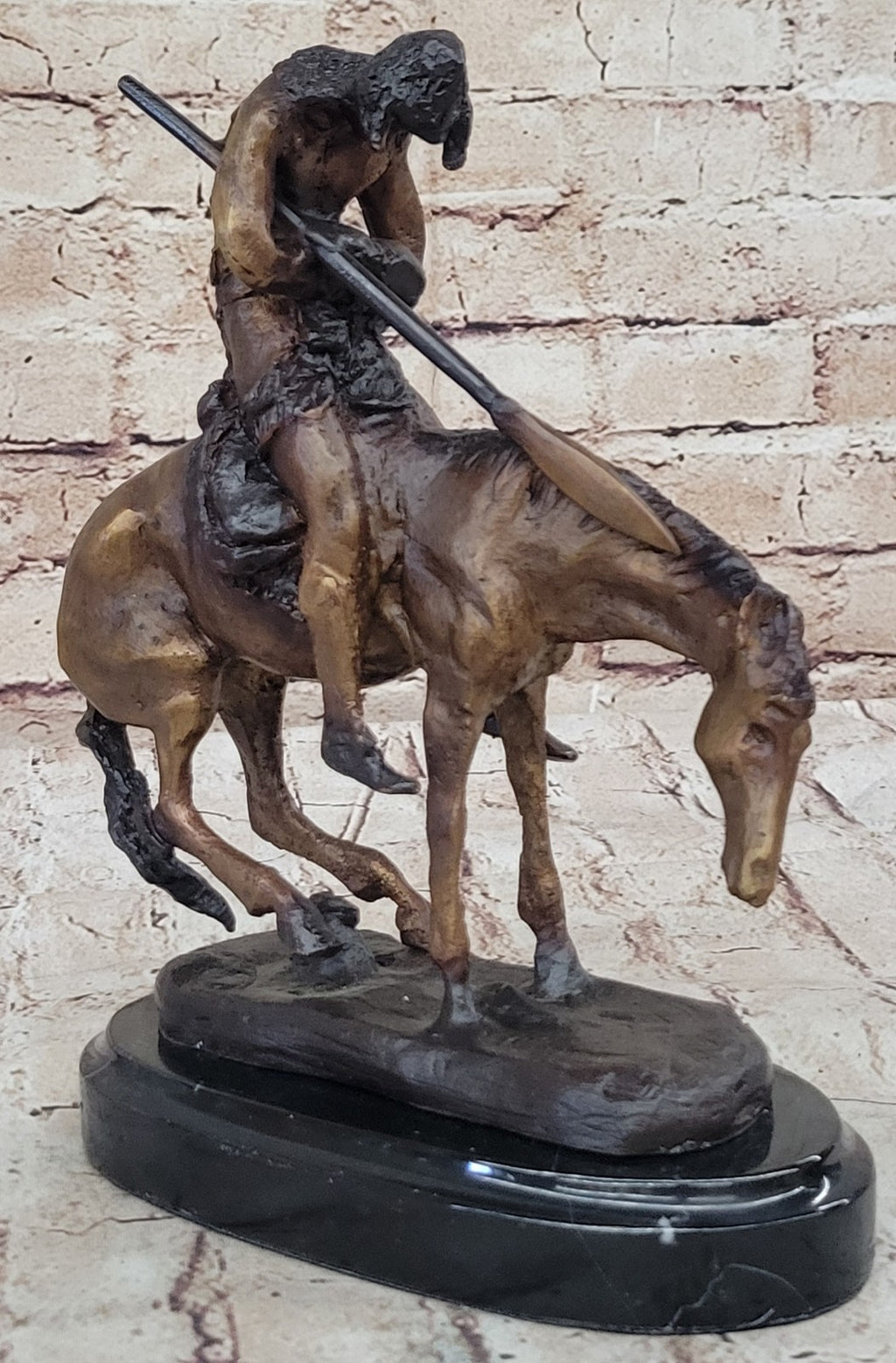 This exquisite sculpture is meticulously handcrafted using the traditional lost-wax casting method, an age-old technique renowned for its intricate detailing and artistry. The brown patina finish not only enhances the visual appeal of the sculpture but also serves as a protective layer, preserving its timeless beauty for generations to come. Mounted on a sleek black marble base, the sculpture exudes elegance and stability, providing a visually stunning display.