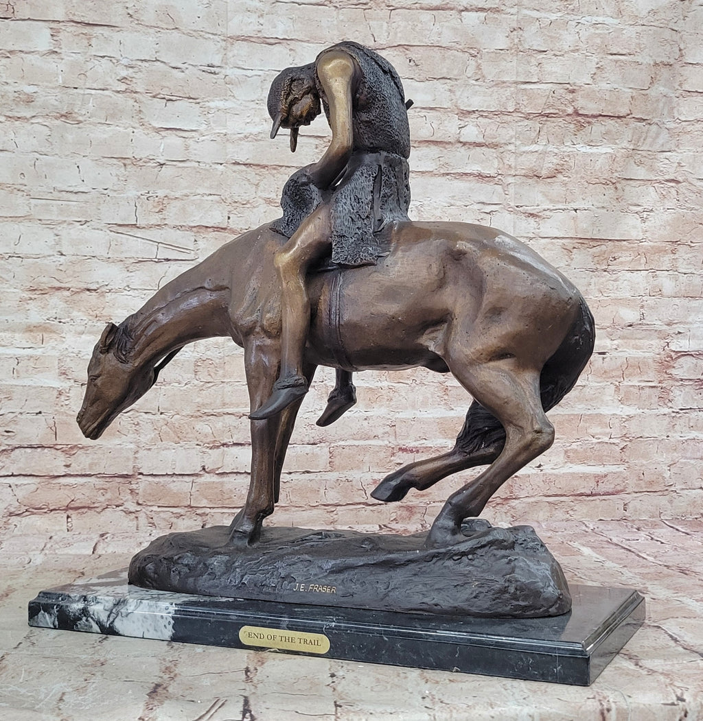 With a rich brown patina finish, the sculpture emanates a sense of warmth and authenticity. It stands proudly on a black marble base, adding a touch of elegance and stability to its presentation. The sculpture bears the signature of the talented artist James Frazer, ensuring its quality and artistic value. This exquisite piece invites viewers to reflect on the profound connection and tranquility that can be found in the companionship of a man and his horse.