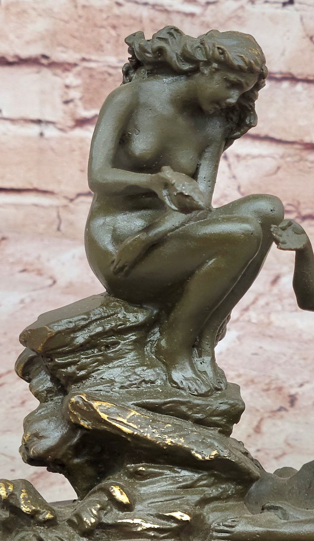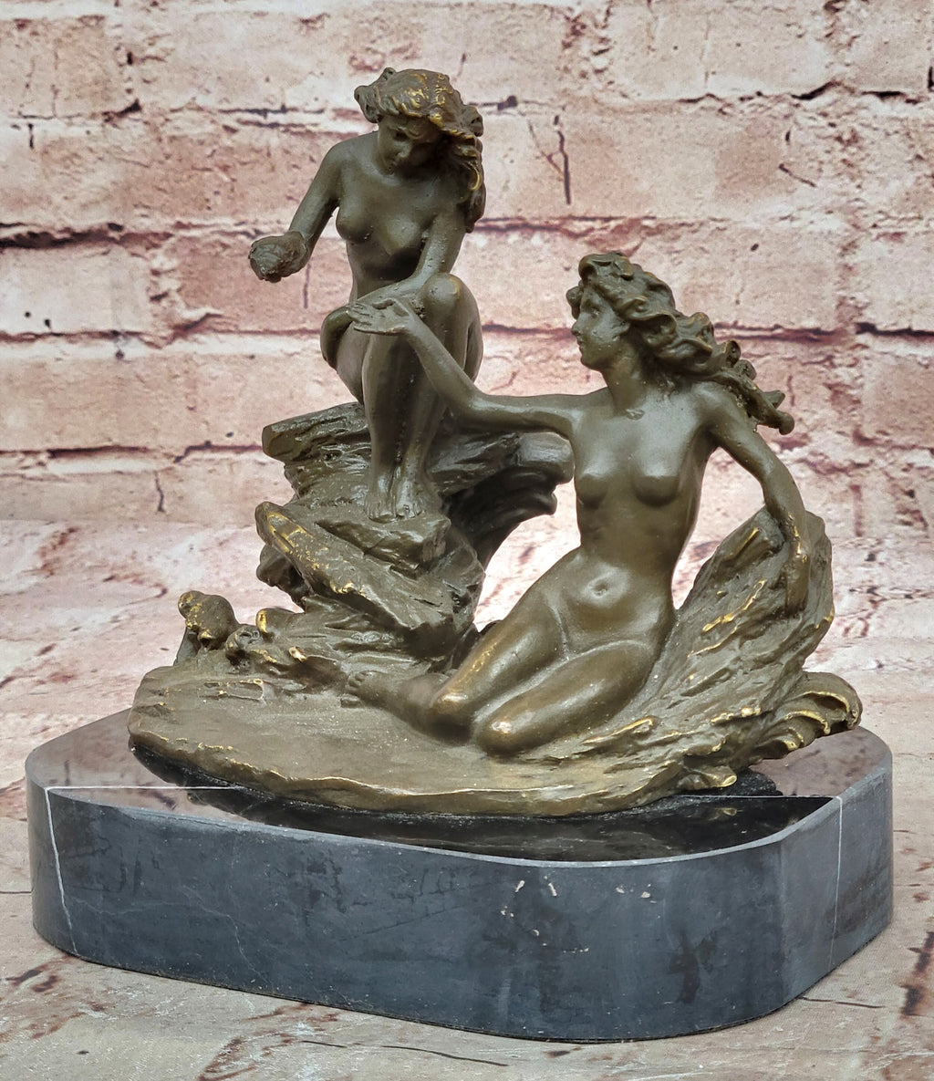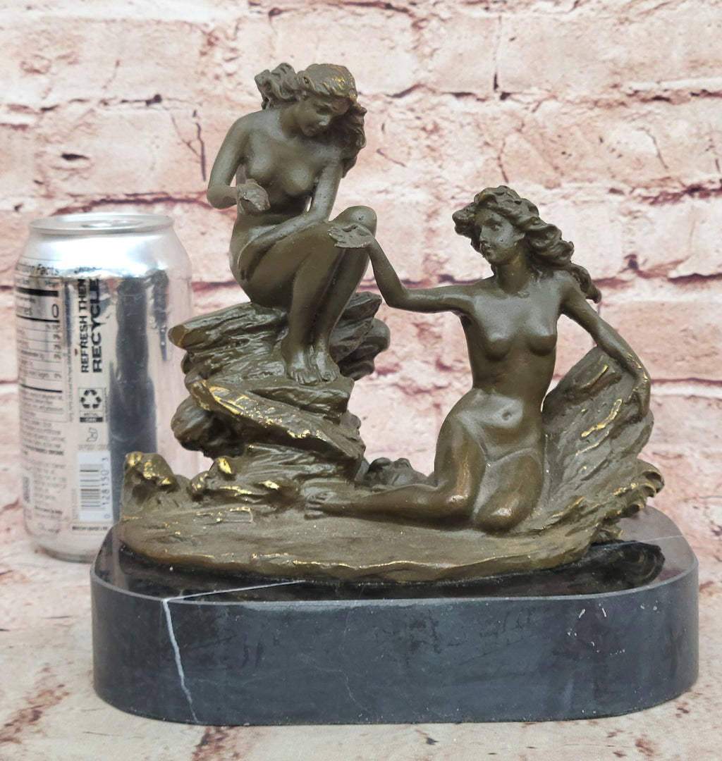 Handmade using the revered lost wax method, the sculpture showcases refined craftsmanship and attention to anatomical detail. The smooth curves of the figures contrast with the textured surface of the rocks, creating a visually rich and balanced composition. The warm brown patina enhances the forms and adds depth to the overall presentation, giving the piece a classic and enduring finish.