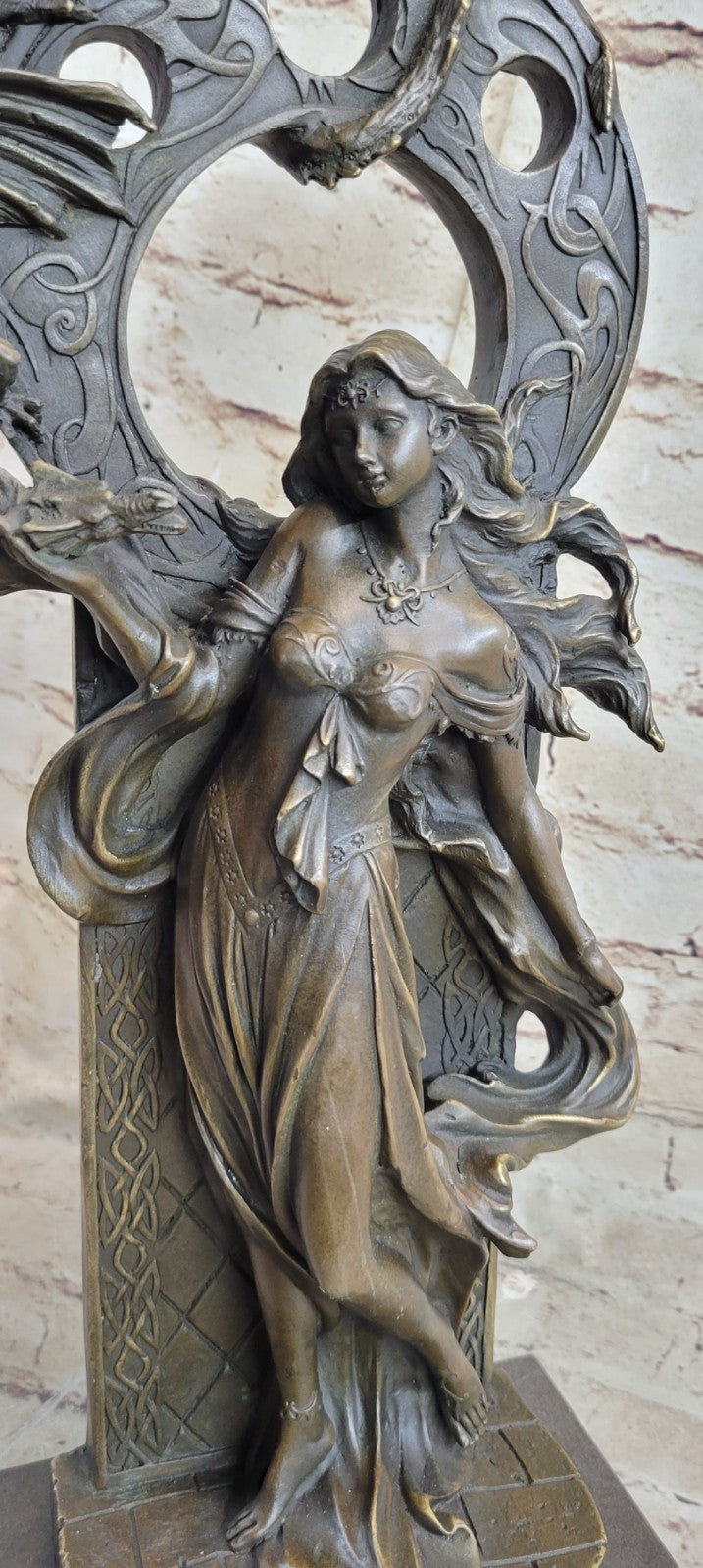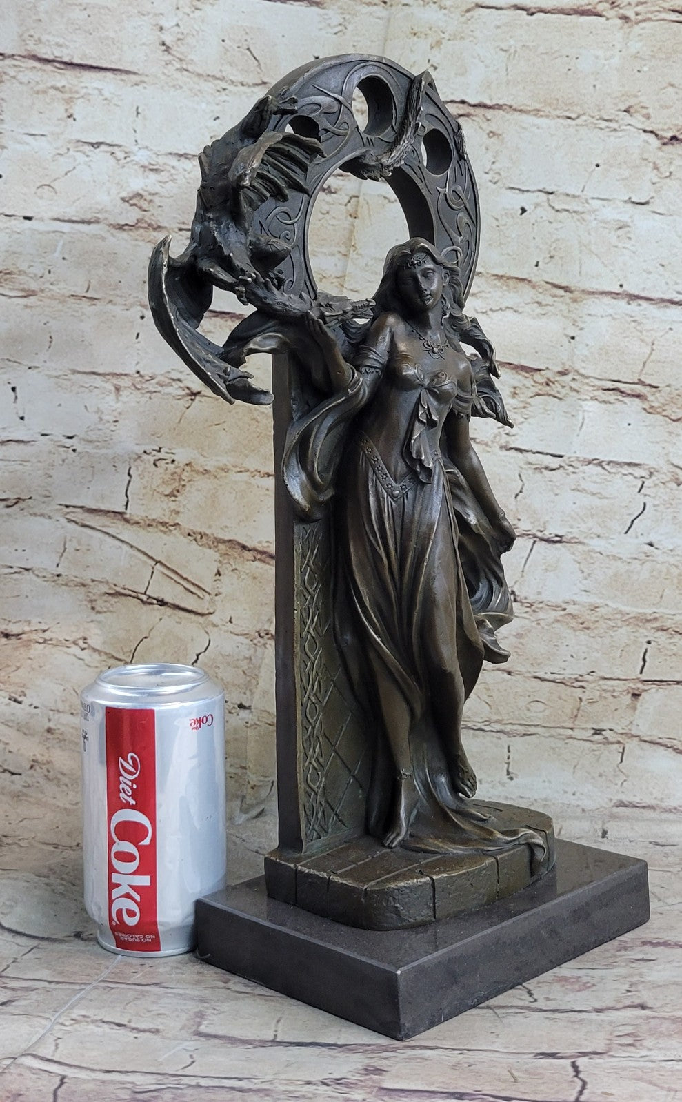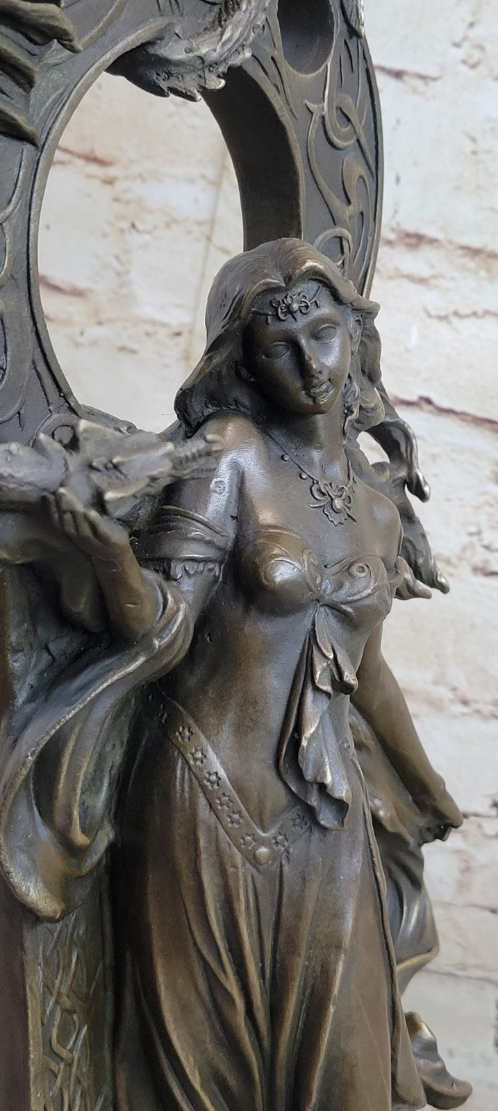 Crafted with meticulous attention to detail, this sculpture is entirely handmade from 100% bronze, utilizing the ancient and revered "Lost Wax Method." The green patina finish adds a touch of enchantment, further accentuating the sculpture's visual appeal. It proudly rests atop a black marble base, providing a solid foundation that complements its elegance.