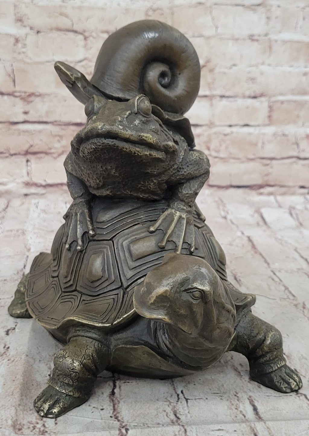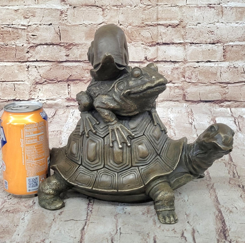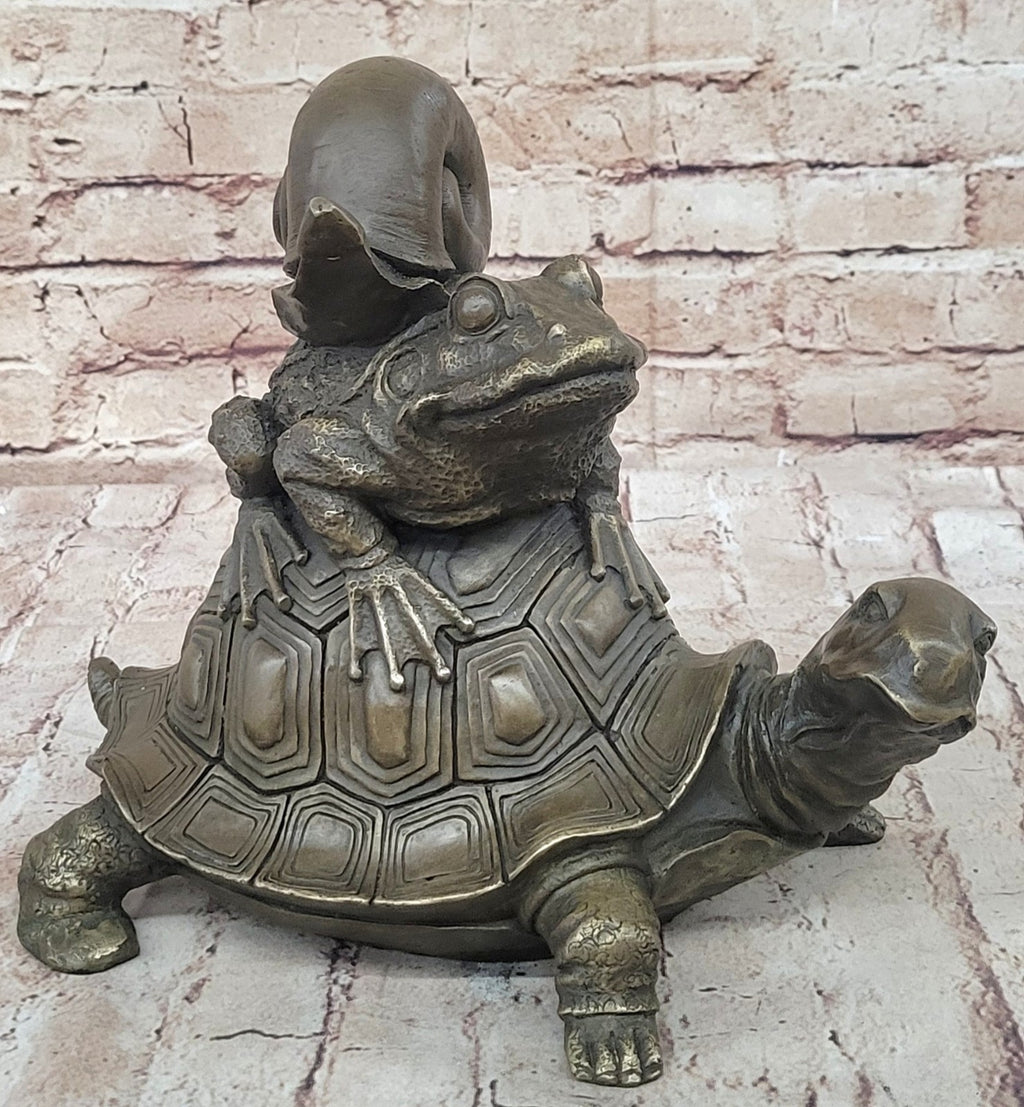 Experience the enchanting allure of the Frog on Turtle with Snail Collectible Garden Decoration Figurine Statue, boasting unparalleled craftsmanship and meticulous attention to detail. This captivating garden ornament embodies the perfect blend of artistry and intricacy, with each element masterfully sculpted to perfection. The exquisite portrayal of the frog perched on the turtle's back, accompanied by a snail, showcases the artist's dedication to capturing the essence of nature's harmonious beauty. Crafted from 100% bronze and meticulously shaped using the revered "Lost Wax Method," this sculpture is a testament to the artist Milo's commitment to excellence and precision in his craft.