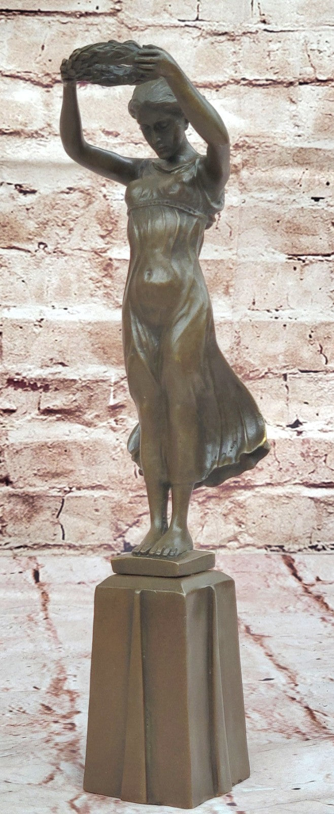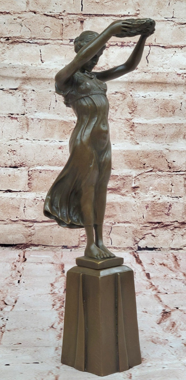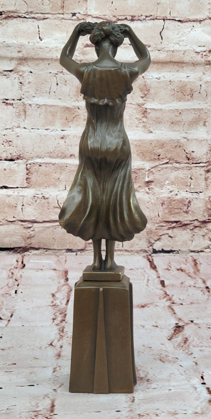 The meticulous details of the maiden's form and the flowing dress reflect the artist's skill, creating a lifelike and emotive representation. The brown patina tarnish, applied through the lost-wax method, adds depth and character to the sculpture, enhancing its timeless beauty. Mounted on a bronze plinth, the artwork stands as a testament to the enduring tradition of bronze casting and the artistry involved in capturing fleeting moments in metal.