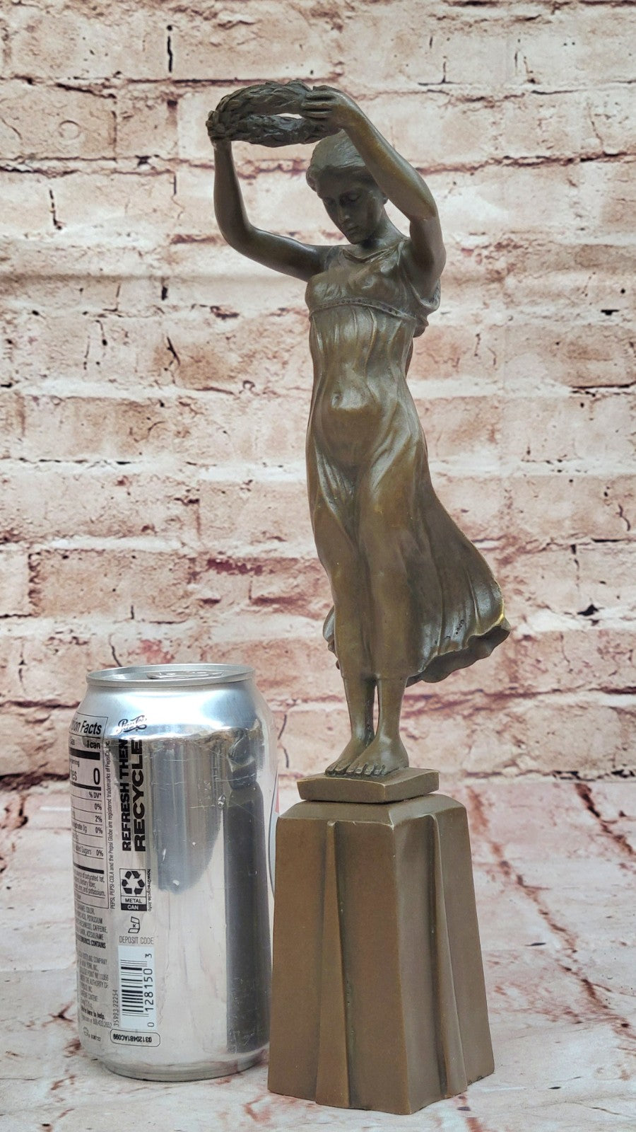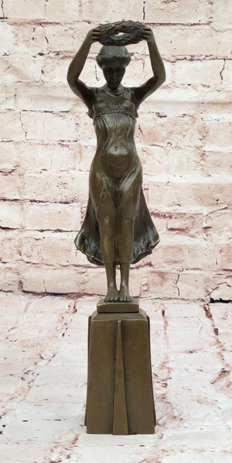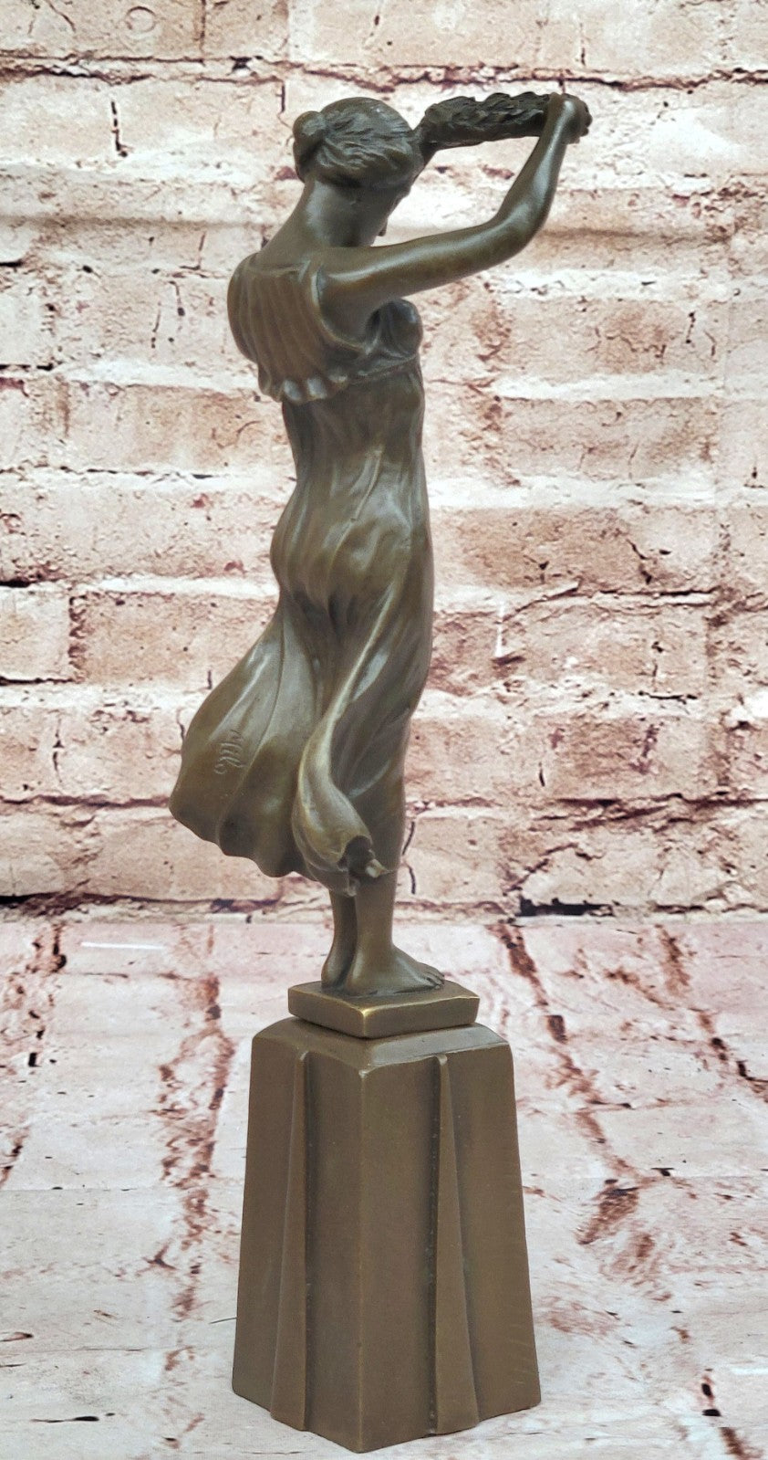The meticulous details of the maiden's form and the flowing dress reflect the artist's skill, creating a lifelike and emotive representation. The brown patina tarnish, applied through the lost-wax method, adds depth and character to the sculpture, enhancing its timeless beauty. Mounted on a bronze plinth, the artwork stands as a testament to the enduring tradition of bronze casting and the artistry involved in capturing fleeting moments in metal.