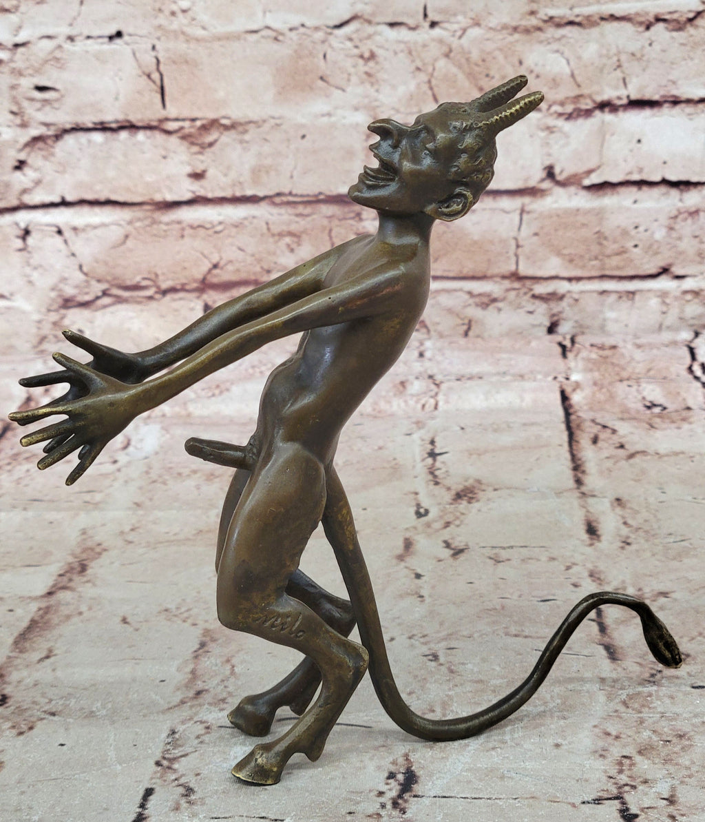 Delve into the realm of mythology with our unsettling bronze sculpture. This bone-chilling depiction portrays a satyr in relentless pursuit of a disinterested nymph. With his arms and hands outstretched, he reaches desperately, hoping to capture her attention. The satyr's devilish face and menacing horns exude an eerie and fearsome presence. The mystifying nature of this mythological creature adds an element of intrigue and perplexity to the sculpture. Crafted from solid bronze using the revered "Lost Wax Method," this piece showcases impeccable craftsmanship and attention to detail. The brown patina preserves its allure and it is signed by the esteemed artist Milo, making it a haunting and enigmatic treasure for collectors and enthusiasts alike.