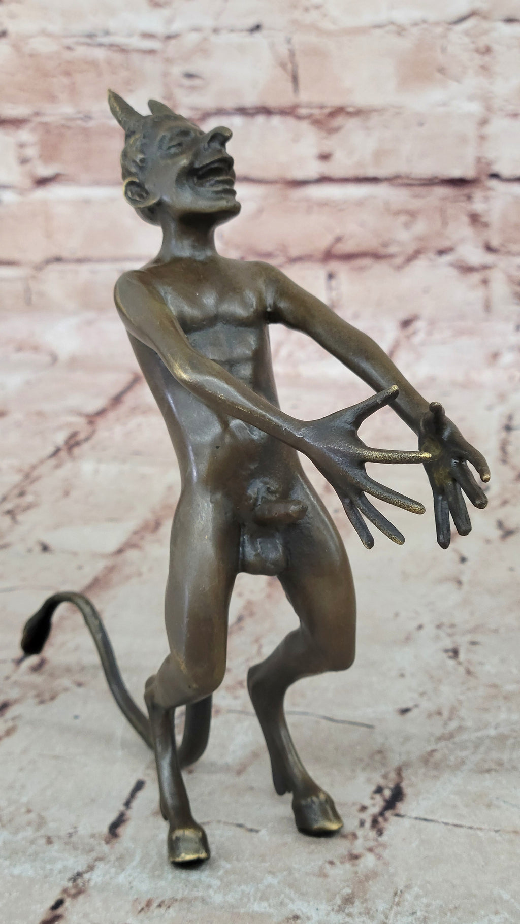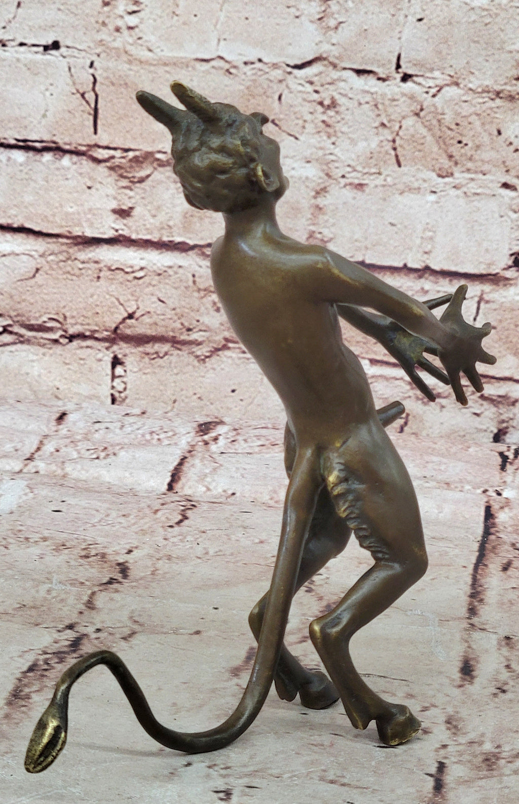 Step into the realm of mythology with our haunting bronze sculpture. Witness the unsettling pursuit of a nymph by a deeply disturbing satyr. Despite her unwavering disinterest, he relentlessly chases her, his extended arms and spread-out hands revealing his desperate attempt to seize her attention. The satyr's devilish face and menacing horns evoke a sense of fear and dread. The enigma surrounding this mythological creature invites contemplation and exploration. Crafted from solid bronze using the esteemed "Lost Wax Method," this sculpture exemplifies remarkable artistry and meticulous execution. Adorned with a brown patina for preservation and bearing the signature of the renowned artist Milo, it is a chilling yet captivating addition to any collection.