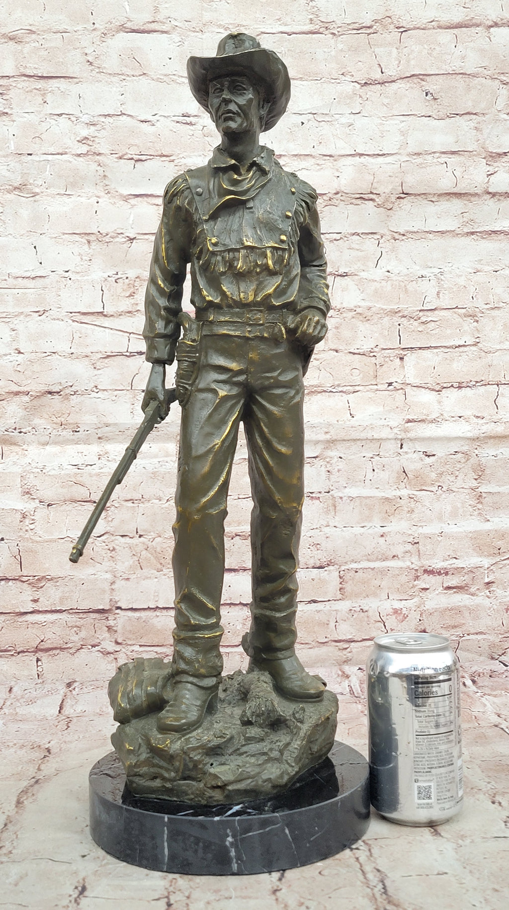 Mounted on a round black marble base, this substantial and eye-catching piece is both durable and elegant, making it ideal for collectors of Western art or anyone looking to infuse their space with rustic charm and historical allure. Signed by the artist, this Milo original is a remarkable tribute to the spirit of the Wild West.
