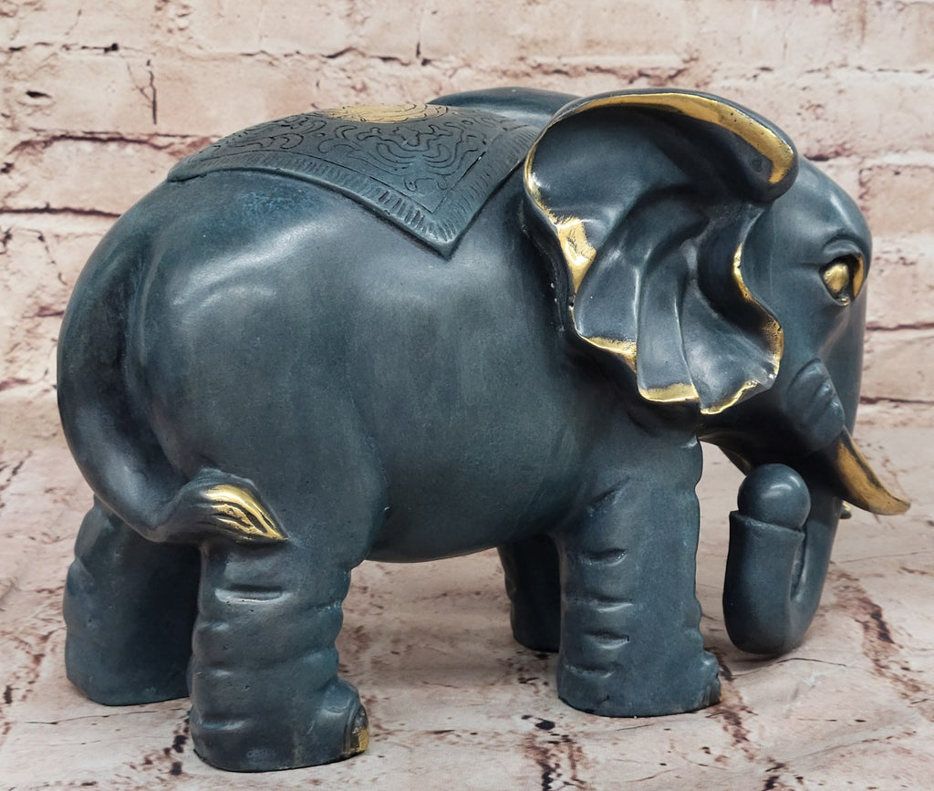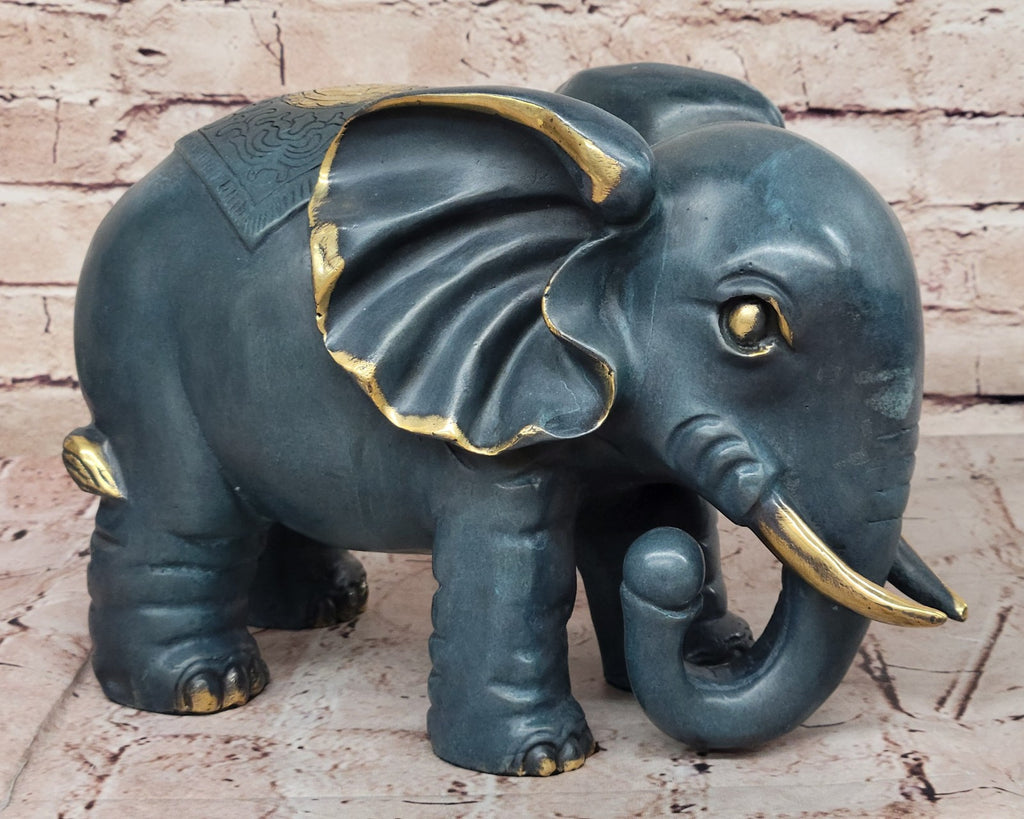 This striking artwork is handmade using the ancient lost wax casting method, ensuring exceptional detail and craftsmanship. The piece is finished with a beautiful green patina that highlights the natural contours of the elephant’s body, while gold accents lend a touch of elegance and spiritual symbolism. These artistic finishes create a vibrant yet classic look that elevates any décor.