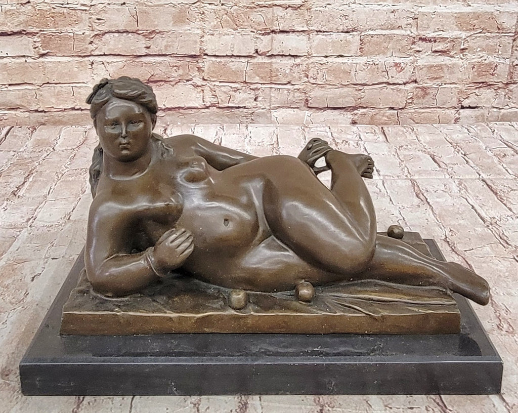 In keeping with the unmistakable artistic style of Botero, this bronze sculpture masterfully blends abstract and representational elements. The woman depicted here boasts a captivating plumpness that defines her every contour, a hallmark of Botero's distinctive approach to form. Serenely reclining on her side, her expression exudes tranquility and joy, manifesting in a serene smile. Her right arm gracefully extends beneath her, while her left arm delicately conceals itself behind her head, lending an air of graceful poise. Crafted using the intricate lost-wax casting method, this sculpture bears witness to the artist's commitment to capturing even the minutest details, as evident in the exquisite folds of skin adorning her stomach, neck, and mouth.