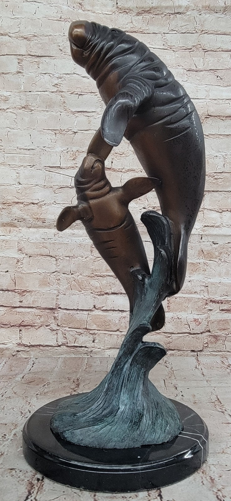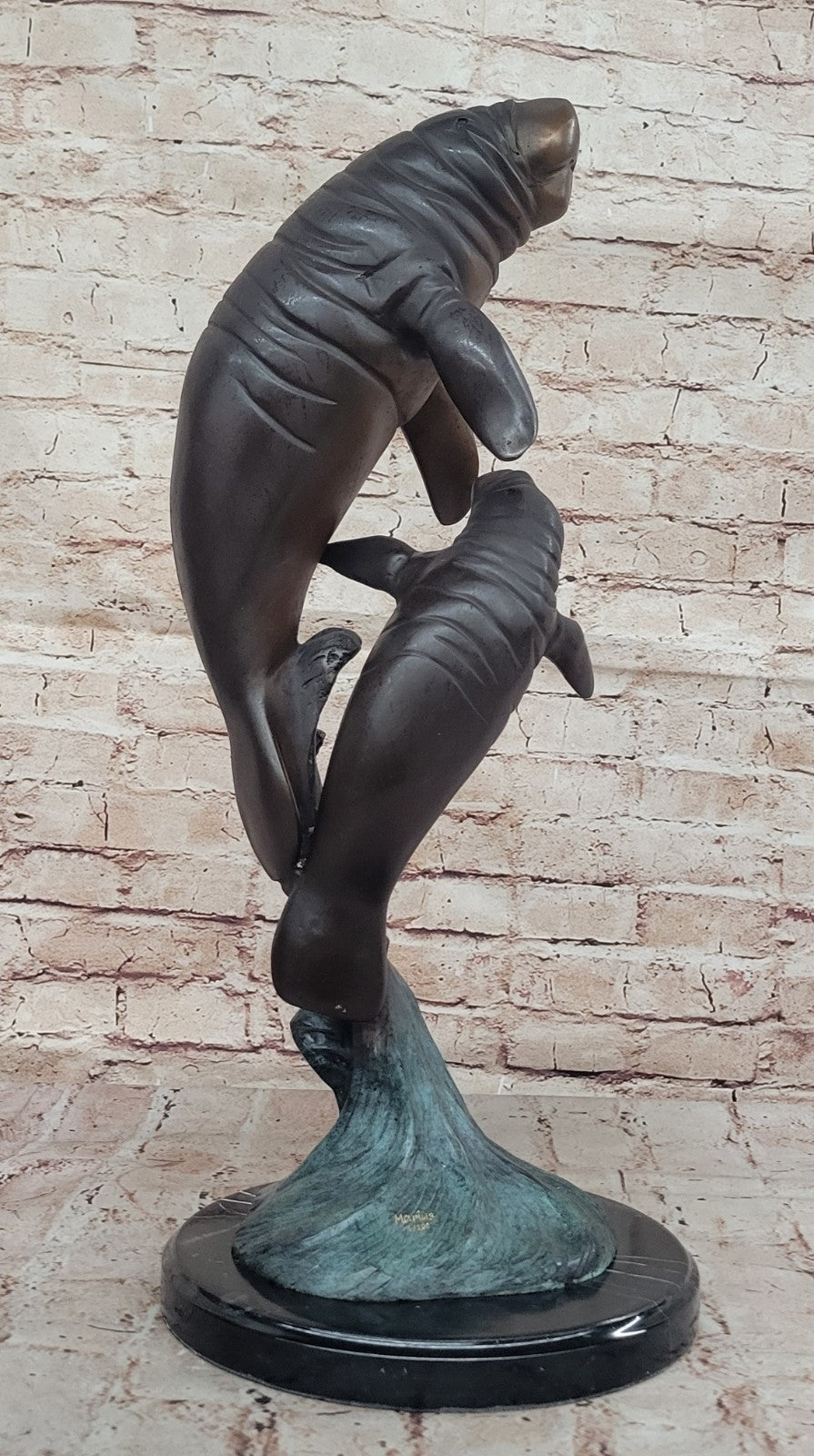 Celebrate the gentle beauty of marine life with the Limited Edition Marius Manatee & Calf Bronze Sculpture, a stunning piece of fine art that captures the tender bond between a mother manatee and her calf. This exquisitely detailed sculpture showcases the intricate textures of the manatees’ skin, the expressive eyes, and the graceful forms that bring these majestic creatures to life. Crafted using the lost wax method, each piece is meticulously handcrafted, ensuring a unique work of art for every collector. The two-tone green and brown patina enhances realism, giving the sculpture depth and a lifelike presence.