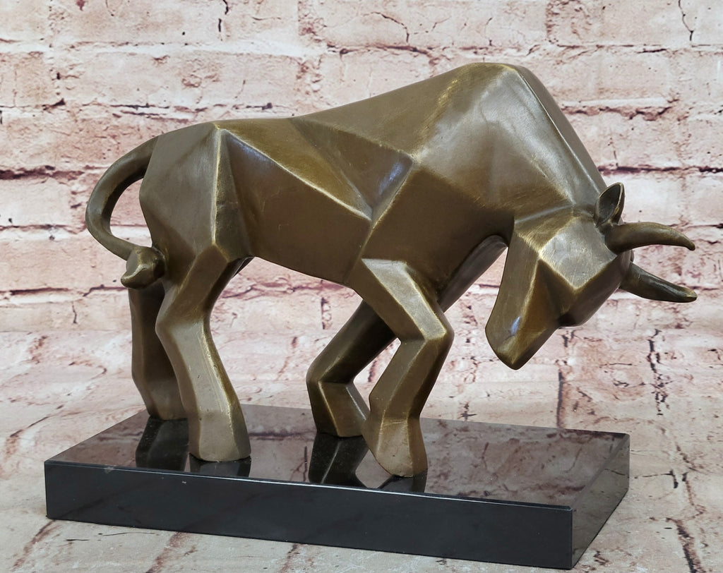 The rich brown patina adds depth and texture to the sculpture, highlighting the intricate details of the bull's muscular physique. Against the backdrop of a sleek black rectangular marble base, the sculpture commands attention with its contrast and elegance. This artwork is not only a visual delight but also a symbolic representation of resilience and power, making it a striking centerpiece in any contemporary art collection or space dedicated to modern sculptures.