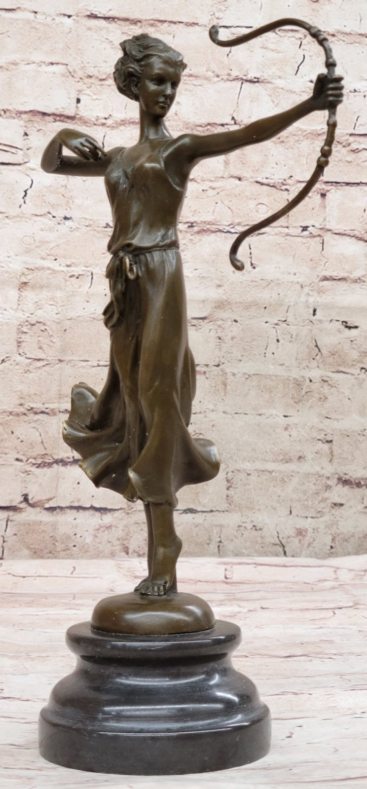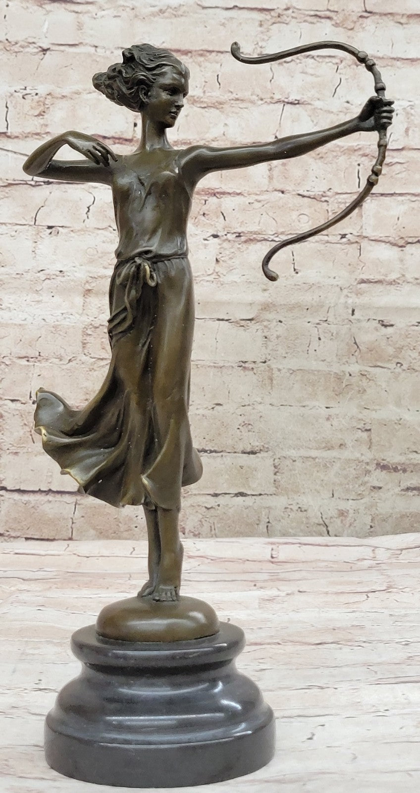 The intricate detailing of the sculpture captures the essence of the moment, with the subtle nuances of the tousled hair and the billowing dress contributing to the sense of energy and vitality in the scene. Crafted entirely from bronze using the revered "Lost Wax Method," the sculpture boasts a rich brown patina finish that lends a timeless and classical appeal to the artwork. Each element, from the delicate features of the maiden's form to the meticulous rendering of the landscape, speaks to the artist's skill and dedication to bringing the narrative to life with exquisite precision.