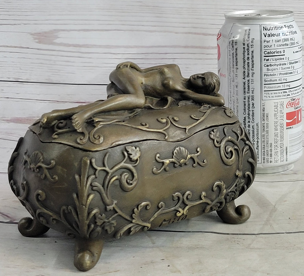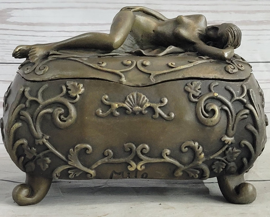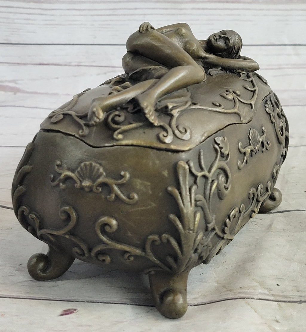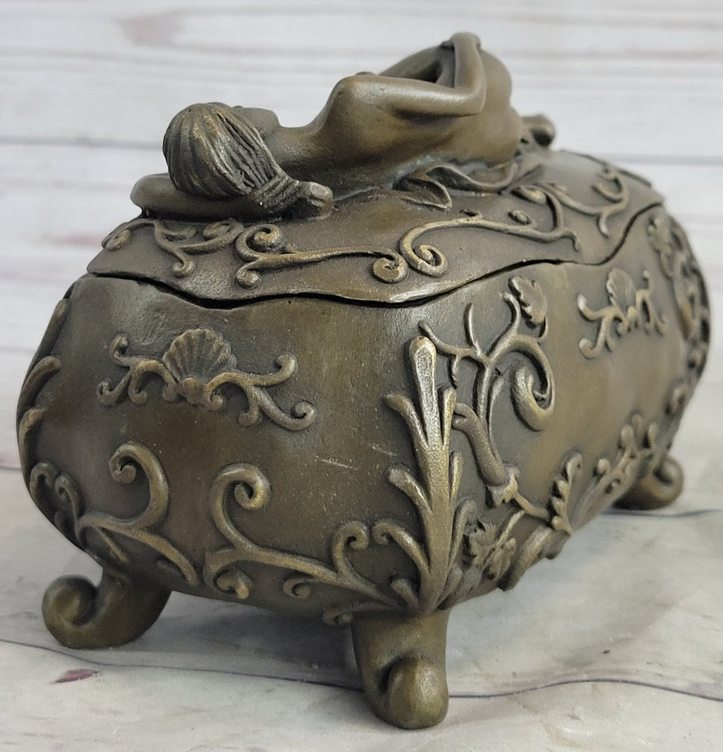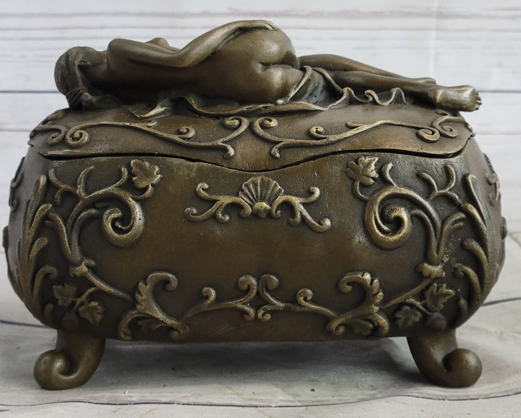 The young girl atop the jewelry holder appears to be gently reclining, her flowing dress clinging to her form as though it is a natural extension of her skin, adding a sense of innocence and serenity to the piece. Every detail has been carefully crafted to enhance its beauty, making it not just a functional jewelry holder, but also a piece of art in its own right.