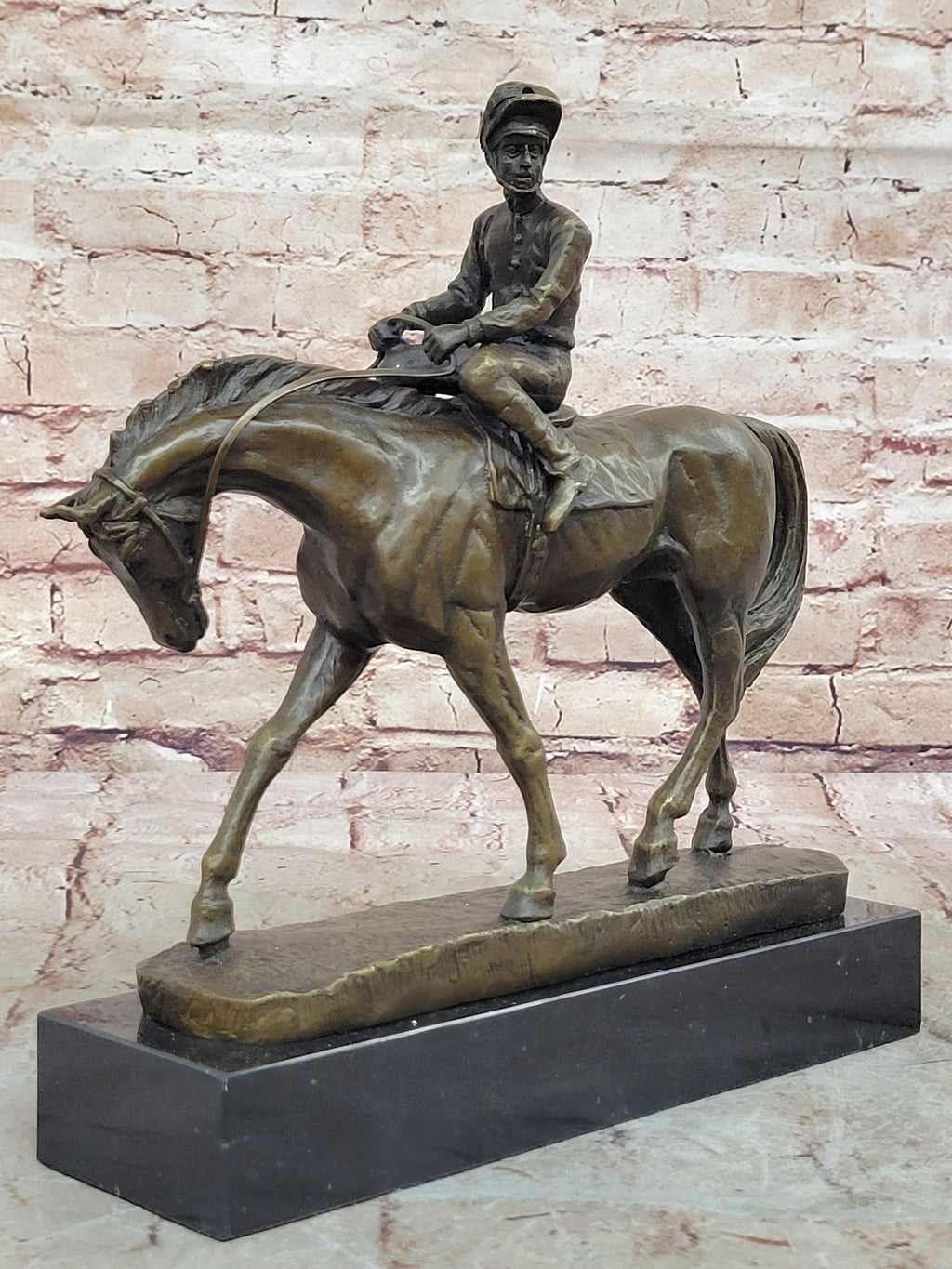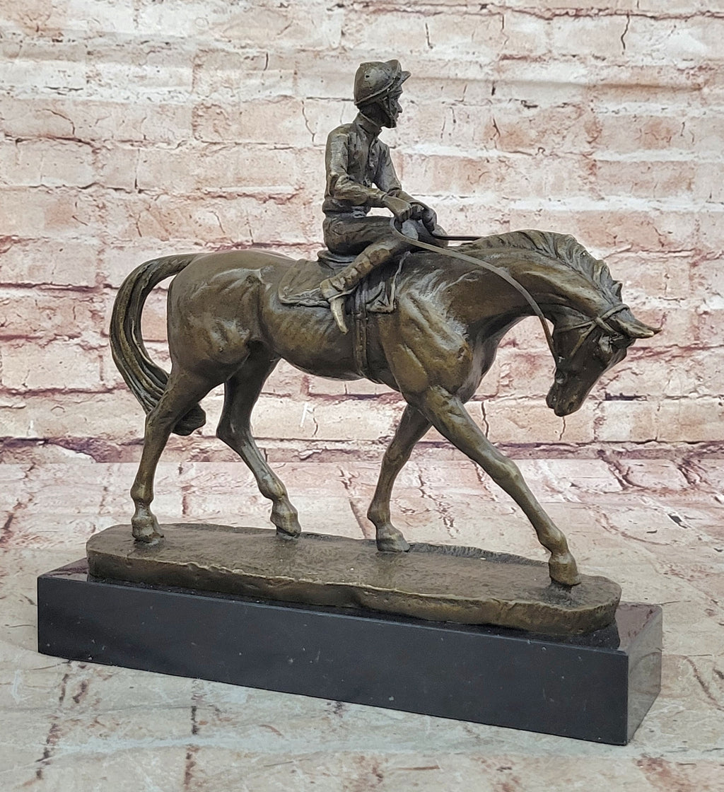 The horse, a magnificent and muscular creature, stands as a testament to the artist's attention to detail and skill. Its powerful presence and beauty are expertly rendered in bronze. This sculpture is a true masterpiece that will undoubtedly resonate with horse lovers and enthusiasts, as it beautifully conveys the unique connection between a jockey and their equine partner.
