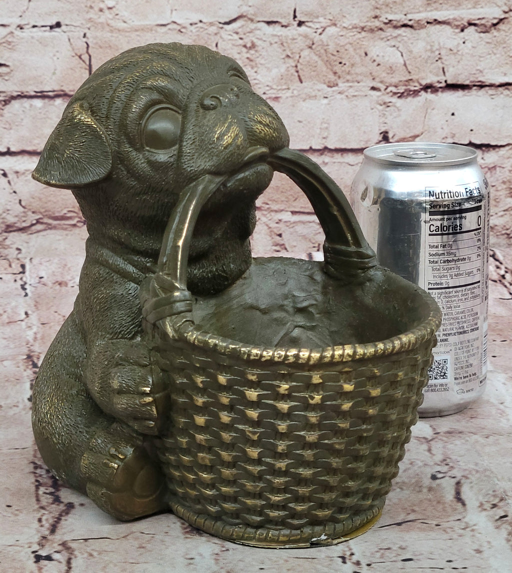 Resting solidly on its base, the basket serves as a functional compartment, ideal for holding keys, jewelry, business cards, or other small items. More than just a decorative accent, this bronze sculpture is a practical piece of art that brings both beauty and utility to any setting. Signed by the artist, it is a thoughtful gift or collector’s item for dog lovers and art enthusiasts alike.