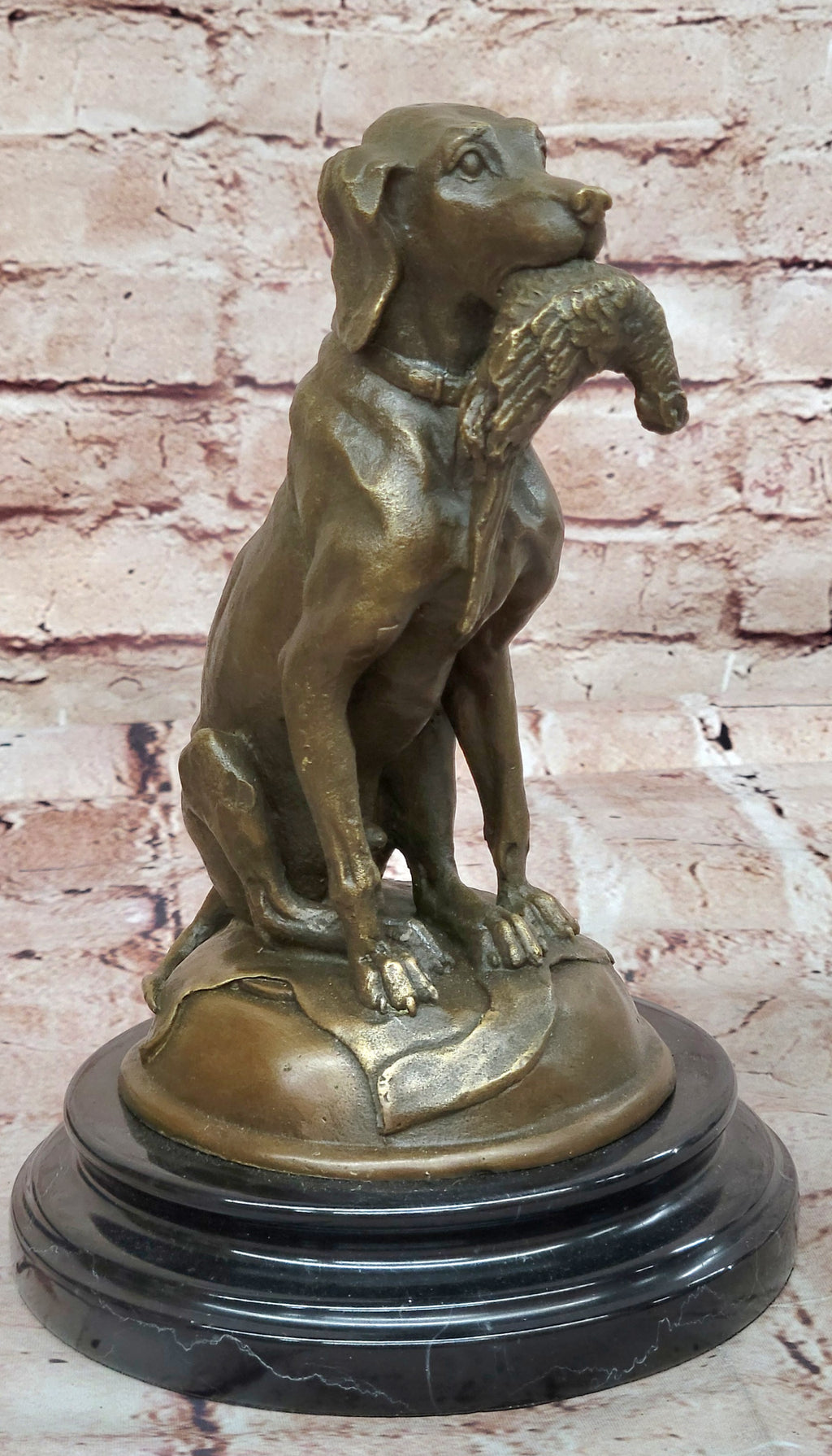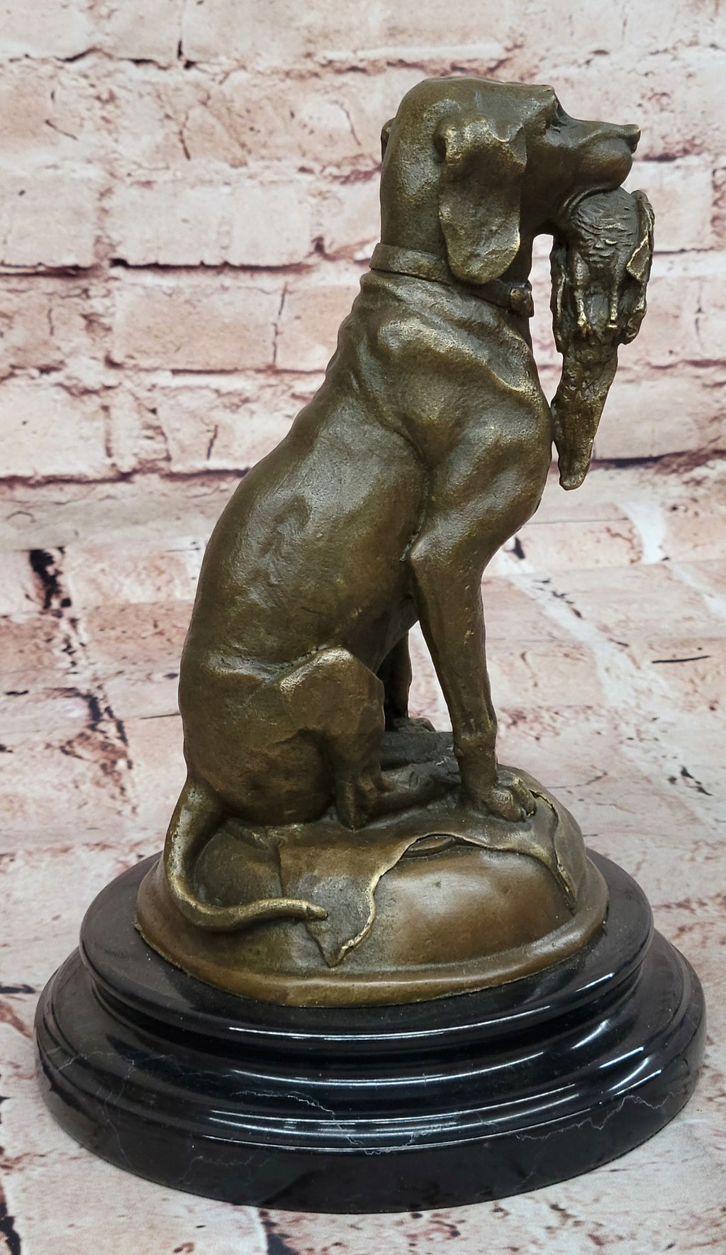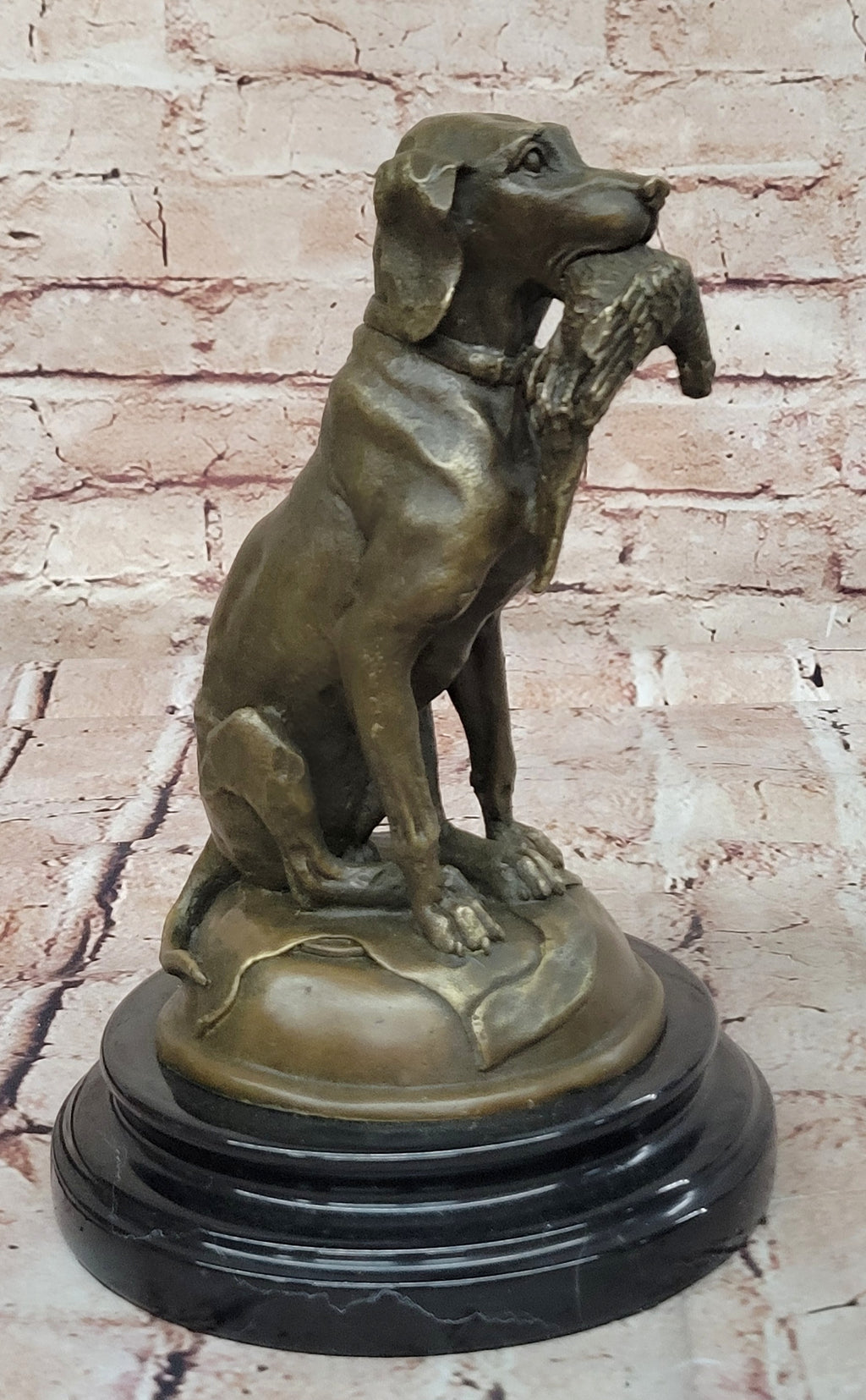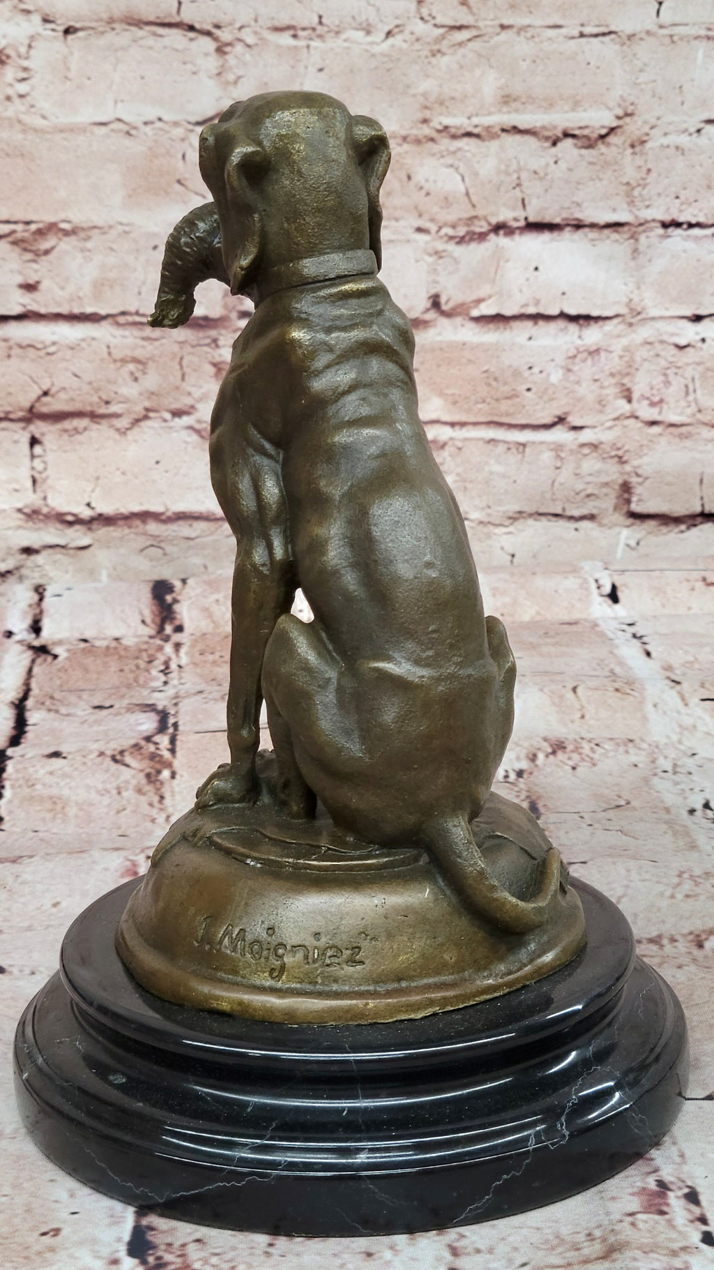 Crafted with precision and artistry, the sculpture is created using 100% pure bronze, ensuring a durable and detailed representation of the Labrador. Enhanced with a dark brown patina finish, the sculpture captures the breed's distinctive features and characteristics, showcasing its gentle yet robust demeanor. Resting on a sleek black marble base, the sculpture stands as a testament to the Labrador's enduring loyalty and companionship, truly exemplifying the notion of being man's best friend. Signed by J. Moigniez, this sculpture serves as a remarkable homage to the Labrador's unwavering dedication and affection, making it a cherished addition to any collection.