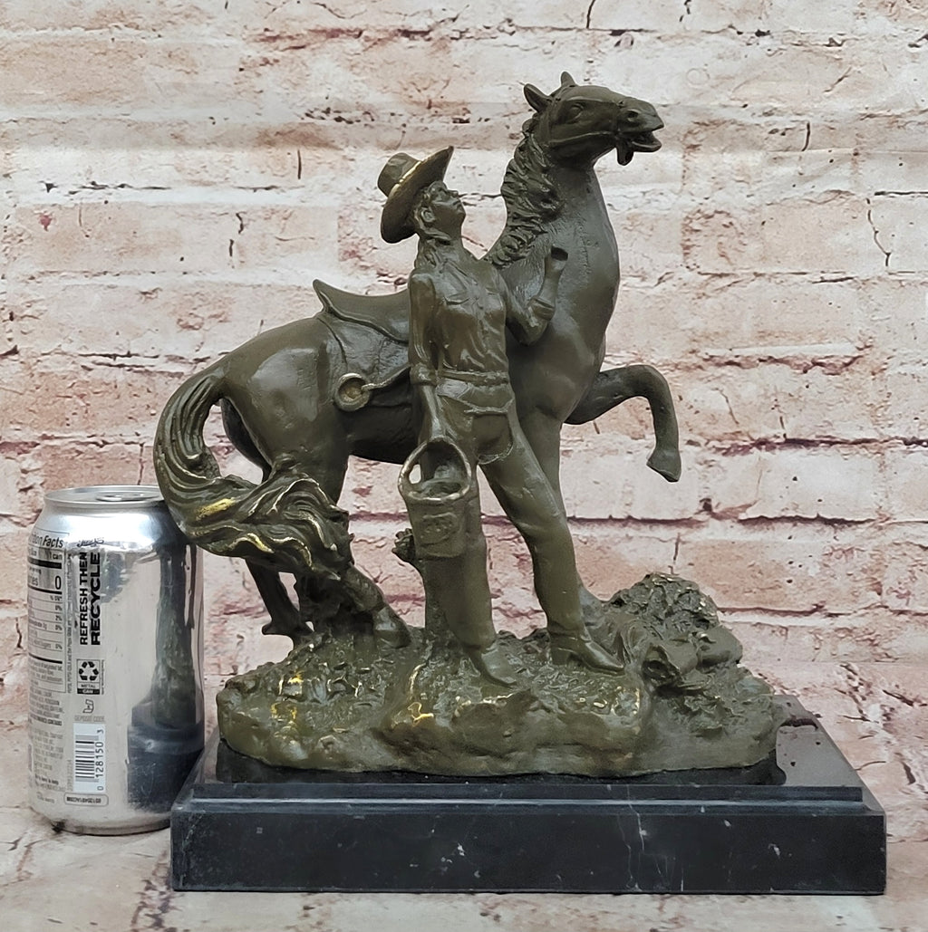 Signed by artist J. Patoue, the sculpture is mounted on a polished black marble base, adding a touch of sophistication and stability. This piece is a beautiful tribute to the spirit of the American West and would make an exceptional addition to any Western art collection or rustic home décor.
