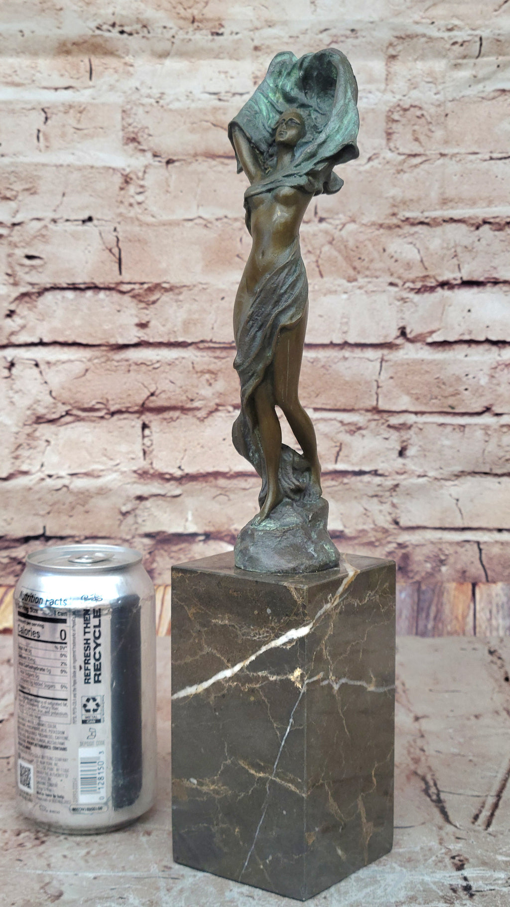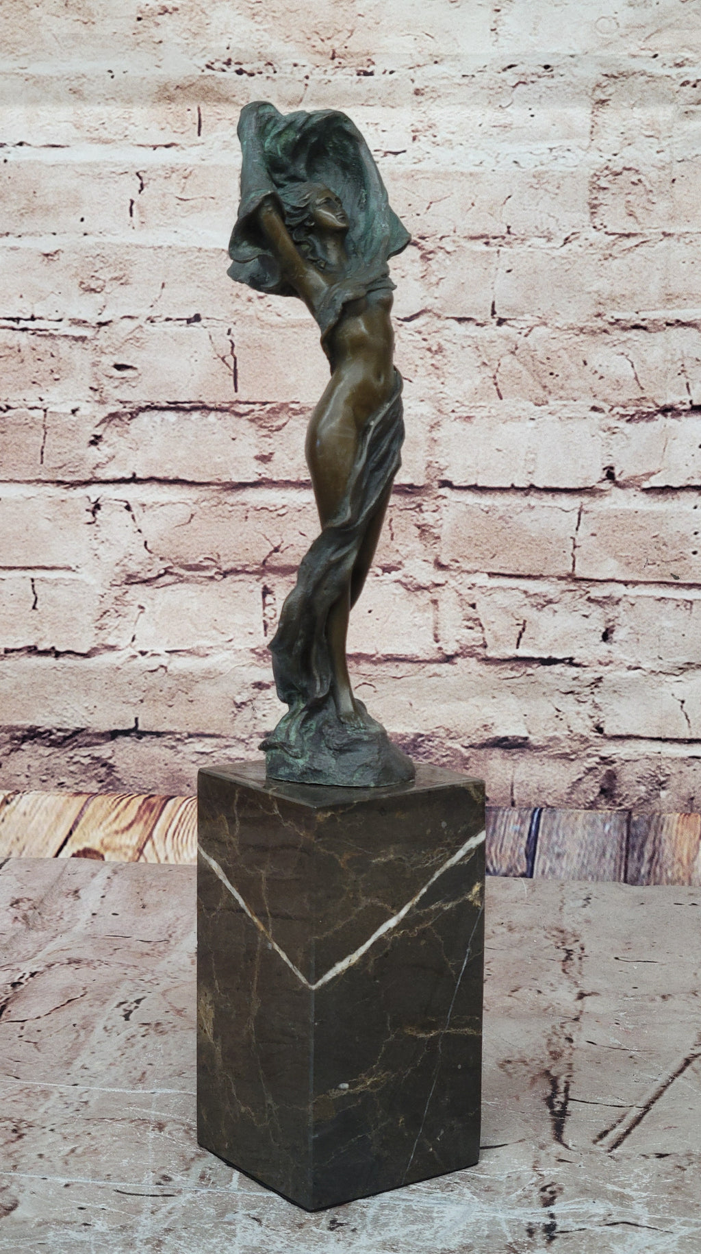 Finished with a two-tone green and brown patina, the sculpture achieves a striking contrast that enhances its visual appeal. The green and brown hues blend seamlessly, highlighting the exquisite details and contours of the figure. The patina not only adds depth to the piece but also ensures its preservation, maintaining its beauty for years to come.