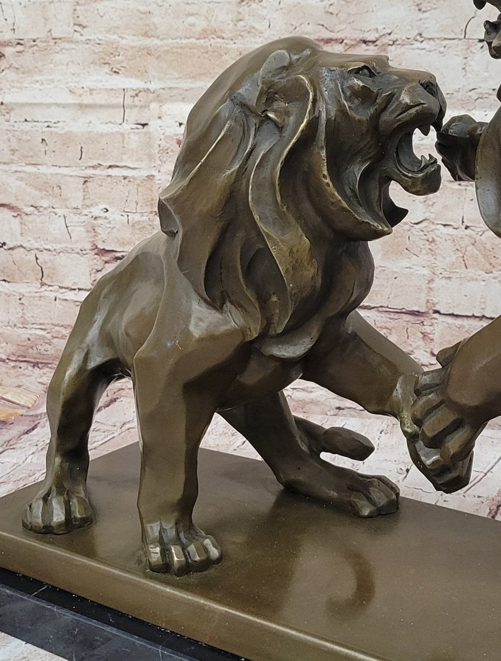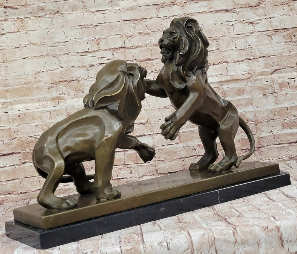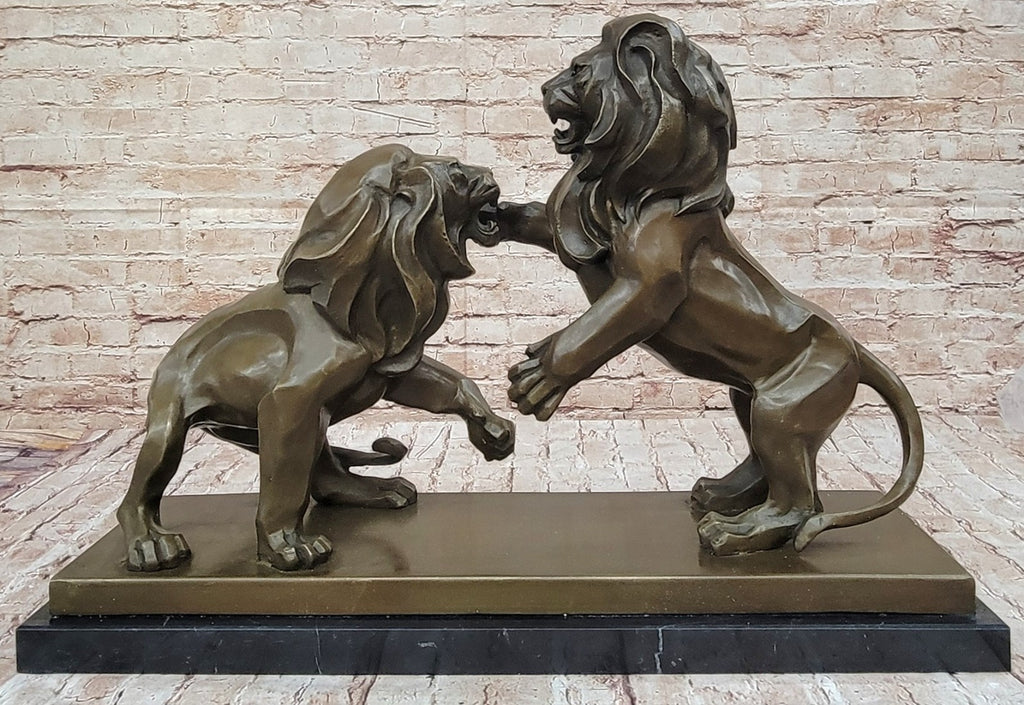 This large bronze sculpture, inspired by Antoine-Louis Barye's iconic work housed in the Louvre, depicts two lions in a dramatic battle. The sculpture's grandeur is accentuated by its meticulous craftsmanship, capturing every detail of the fierce confrontation between the majestic beasts. Signed and created from exclusive materials, this piece exudes a classic aesthetic that makes a striking impression in any interior.