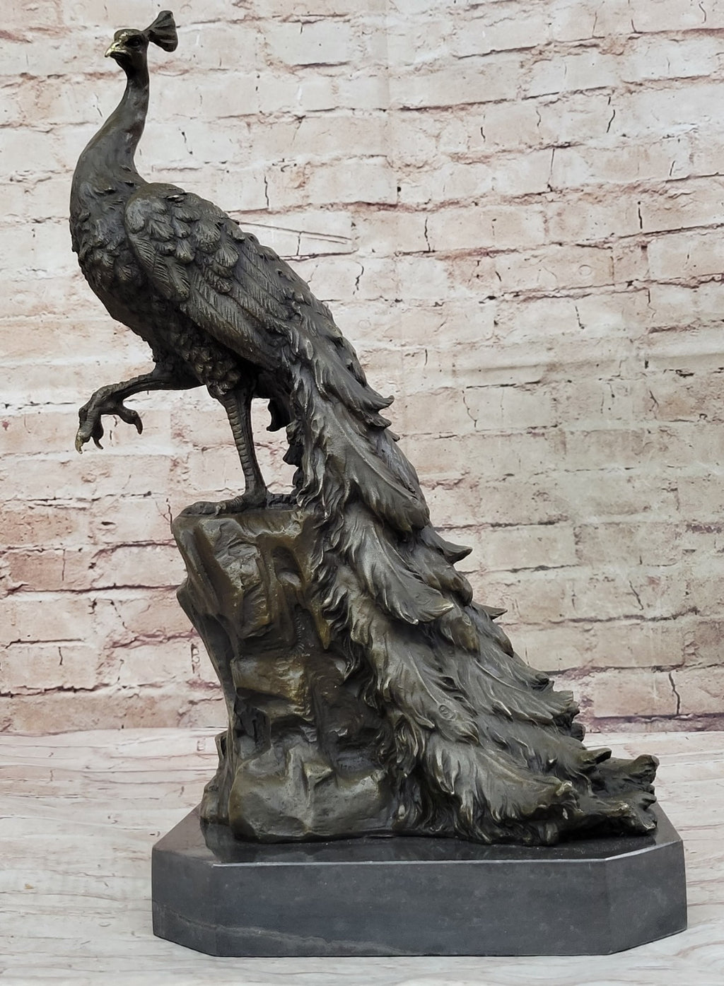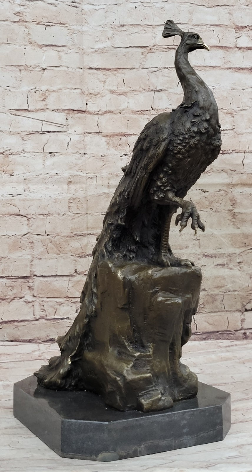 The peacock's majestic tail, adorned with an intricate paisley pattern of feathers, is elegantly raised, displaying its breathtaking beauty. Hand-polished to achieve a rich dark green finish, the peacock's body emanates dignity and grace. Every aspect of this bronze statue is meticulously crafted, preserving the essence of the peacock's natural elegance.