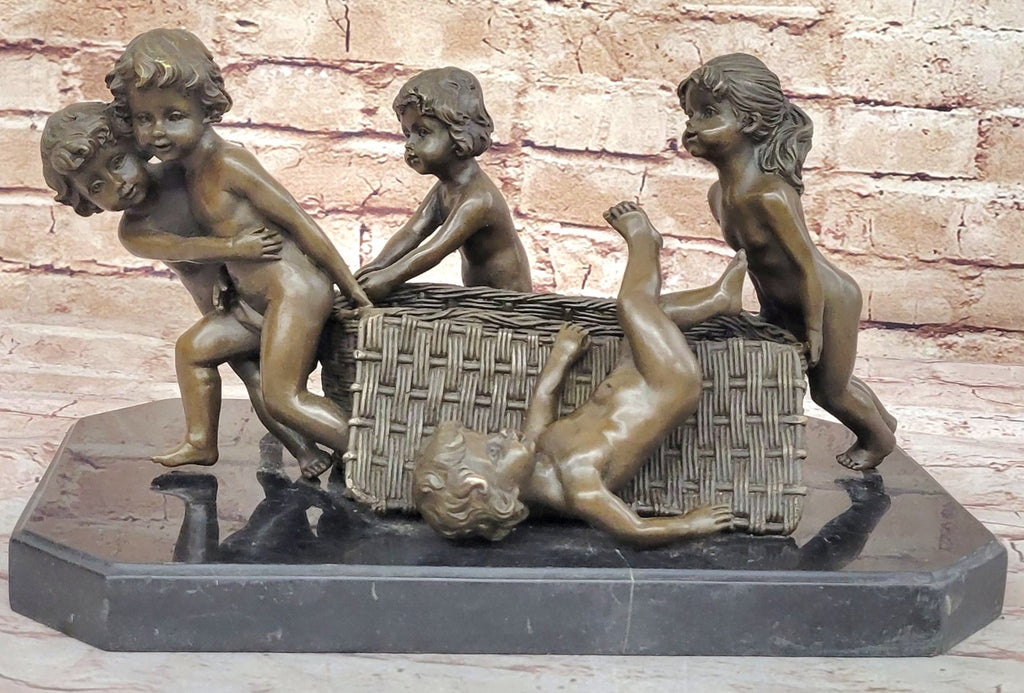 The centerpiece portrays baby children engaged in the delightful activity of pushing and pulling a basket, their playful antics frozen in time. Each detail, from the children's expressive faces to the intricate folds of their clothing, reflects Larche's commitment to realism and artistic excellence.