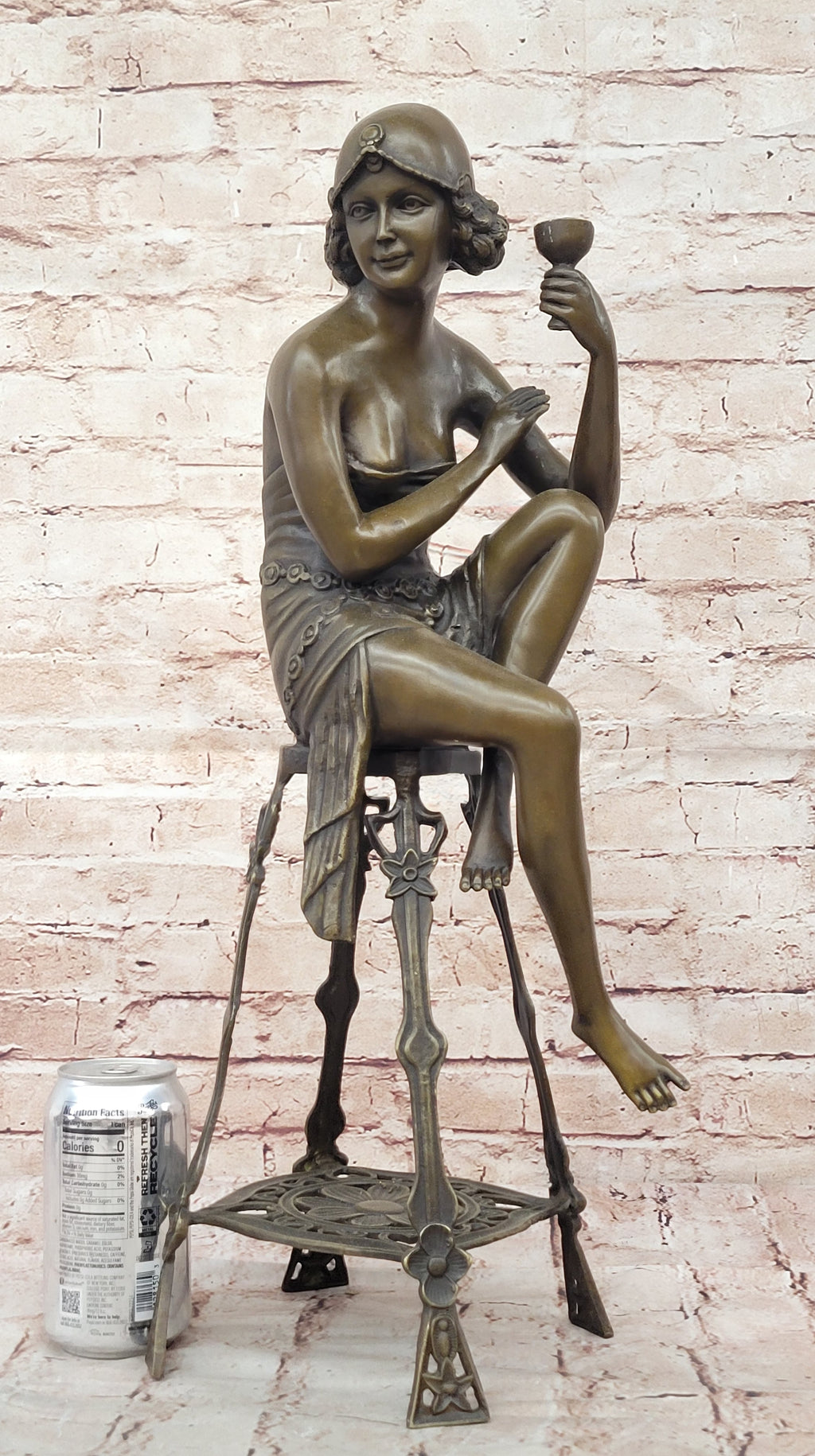 The Flapper, perched confidently on a black patina stool, embodies the spirit of the era with her loose reddish patina short dress that elegantly drapes over her curves. Her gold beaded belt accentuates her waist, and a bow at the back adds a touch of flair to her attire. This sculpture beautifully portrays her relaxed demeanor, as she rests a hand on her pulled-in knee while her other leg swings down, revealing her voluptuous thighs in a rich brown patina. Her black bobbed hair, peeking from beneath her fitted cloche hat, adds to her allure.