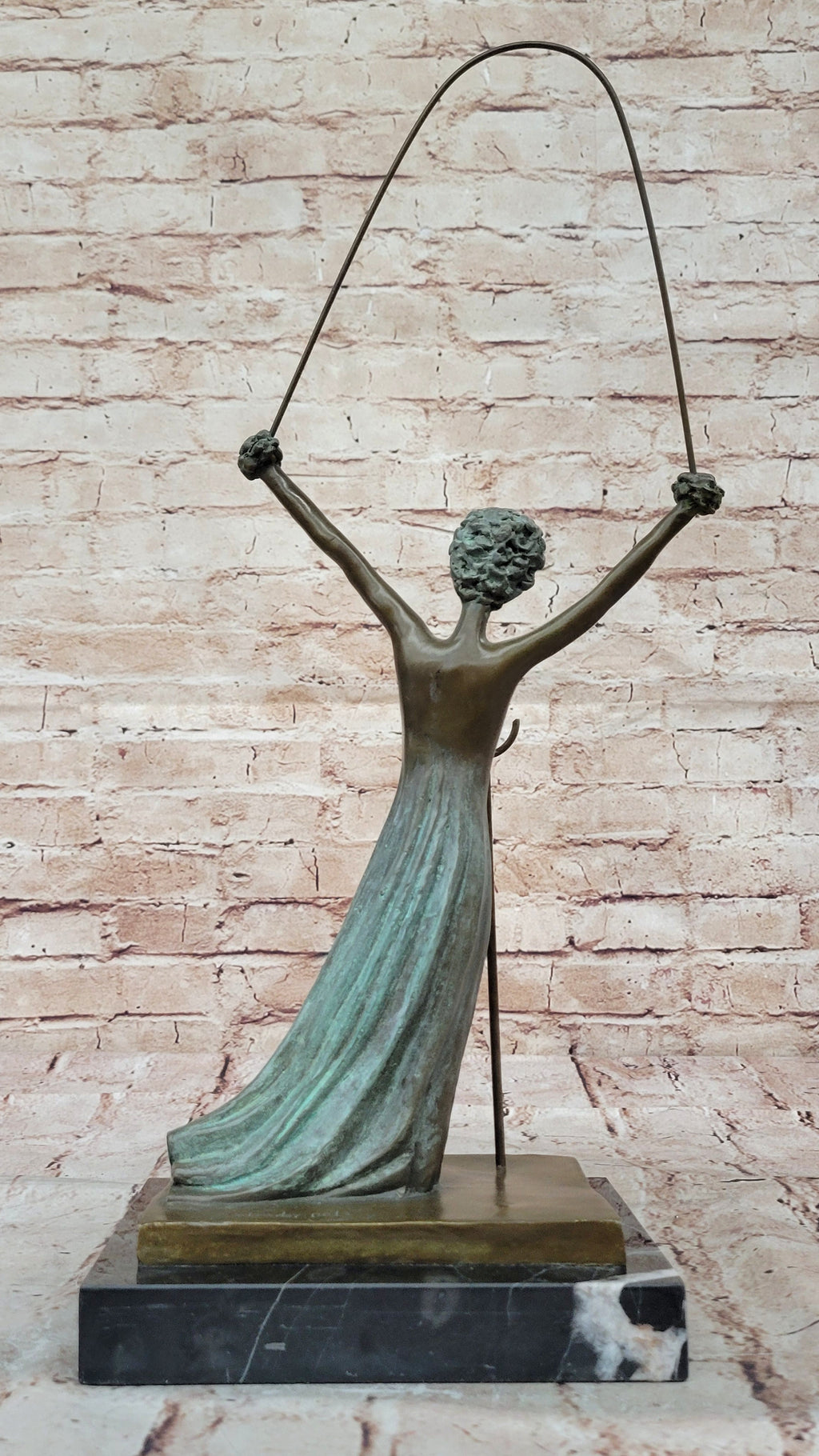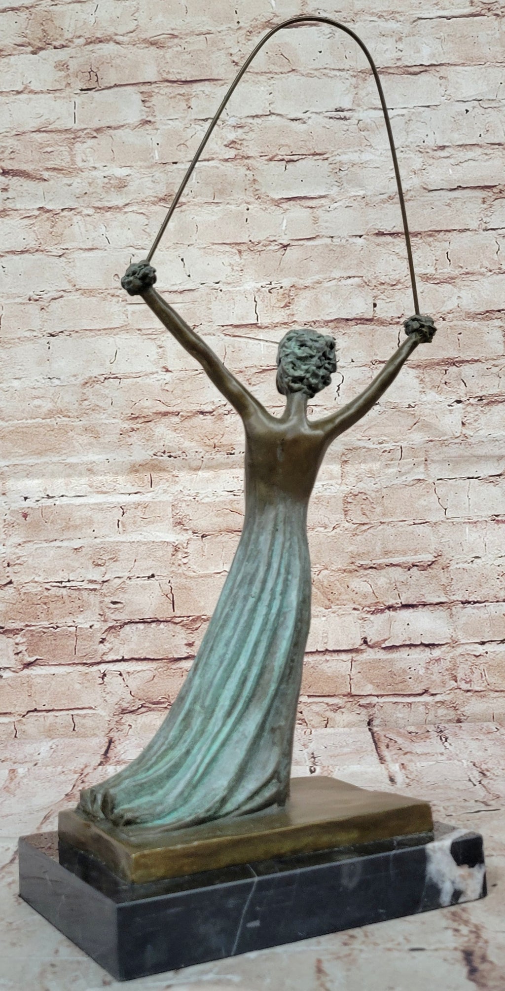 Transport yourself to a world of whimsy and imagination with this exceptional bronze sculpture inspired by the surrealist genius Salvador Dali. Capturing the essence of Alice in Wonderland, the sculpture celebrates the character's youthful innocence and her journey through a fantastical landscape. As a symbol of femininity in full bloom, Alice's hands and hair metamorphose into exquisite roses, radiating a sense of enchantment and beauty. The intricate interwoven rope signifies the complex relationship between reality and fiction, blurring the boundaries of the imagined and the real. Created with utmost artistry using the revered "Lost Wax Method," this sculpture showcases meticulous craftsmanship, accentuated by a captivating two-tone patina finish in shades of brown and green. Set upon a sleek black marble base, graced with Salvador Dali's signature, this bronze masterpiece promises to captivate collectors and art enthusiasts alike, offering a timeless and mesmerizing addition to any art collection.