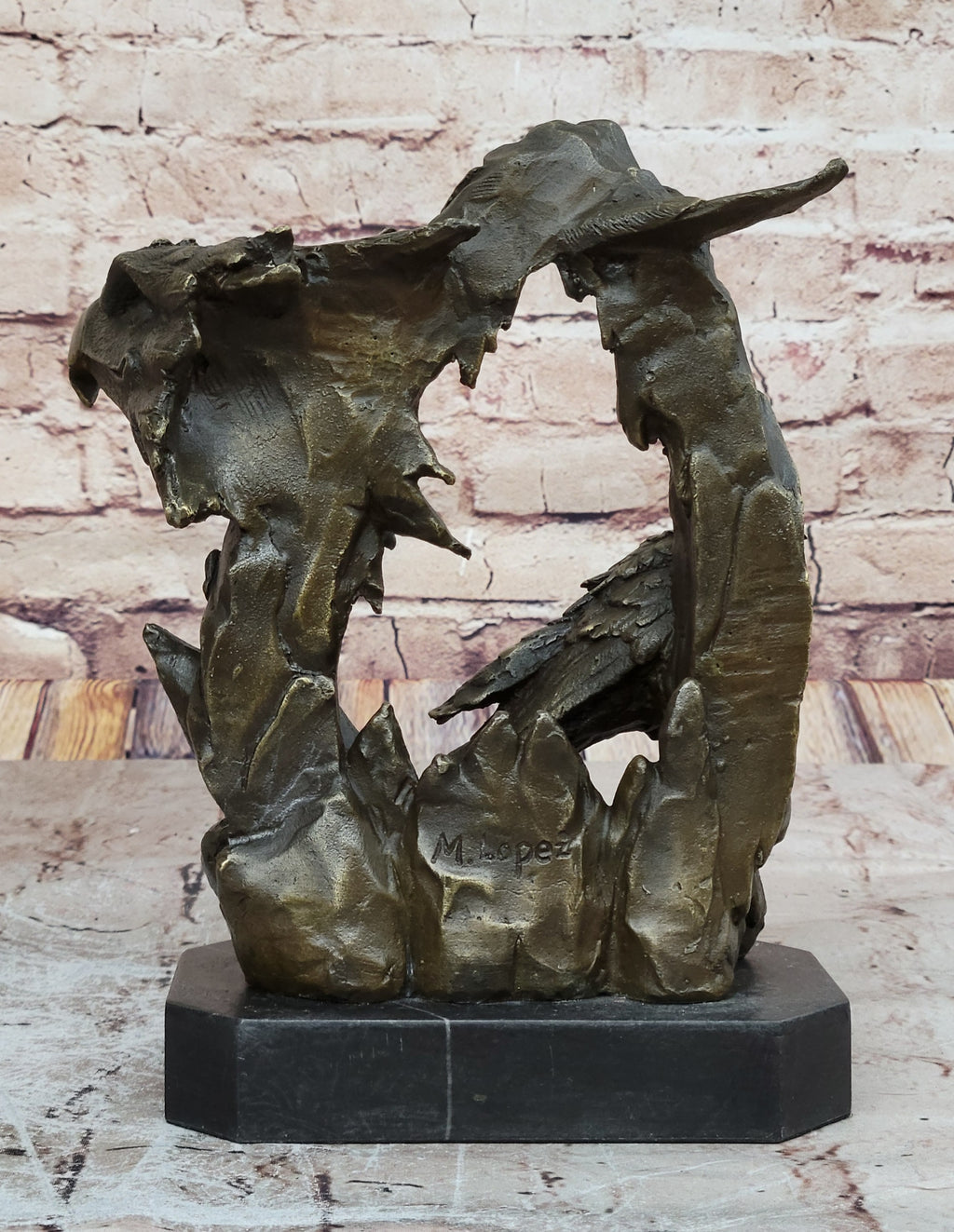 Crafted by skilled artisans, this magnificent bronze sculpture is meticulously shaped using the ancient lost-wax casting technique, ensuring its authenticity and exquisite craftsmanship. The feathers are delicately stained with a brown patina tarnish, lending a captivating touch of realism. Resting majestically on a sleek black marble base, this sculpture stands as a testament to the artist Miguel Lopez's vision and talent, with his signature underscoring its artistic authenticity.