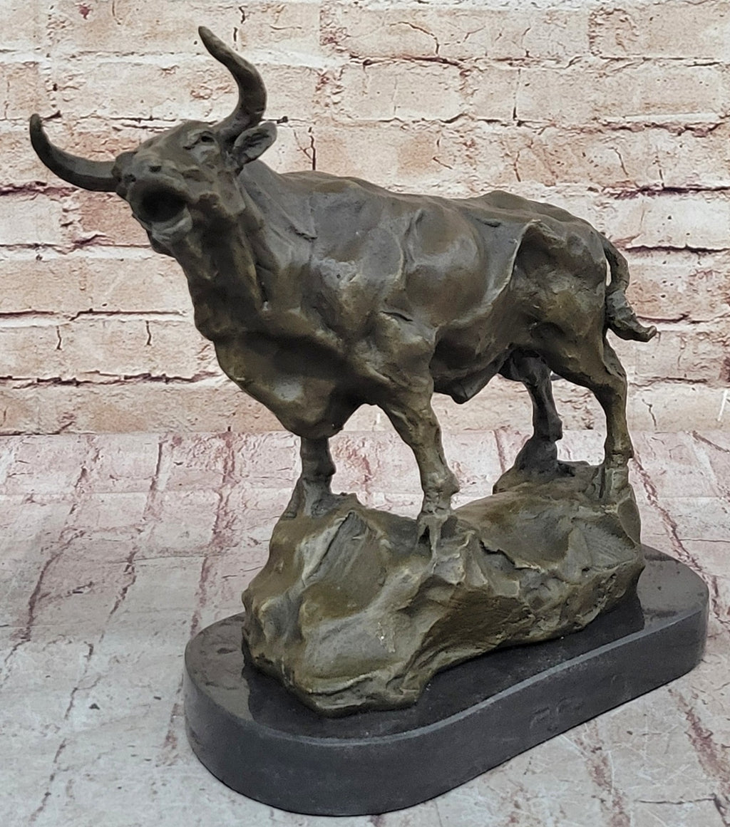 Crafted using the ancient "Lost Wax Method" of casting, this sculpture is a true testament to the artistry and skill required to create fine bronze work. The two-tone brown patina enhances the depth and texture of the bull's figure, adding a lifelike richness that draws the eye to every meticulously sculpted detail. The piece is mounted on a solid black marble base, providing both aesthetic contrast and sturdy support, making it a bold centerpiece for any art collection or display.