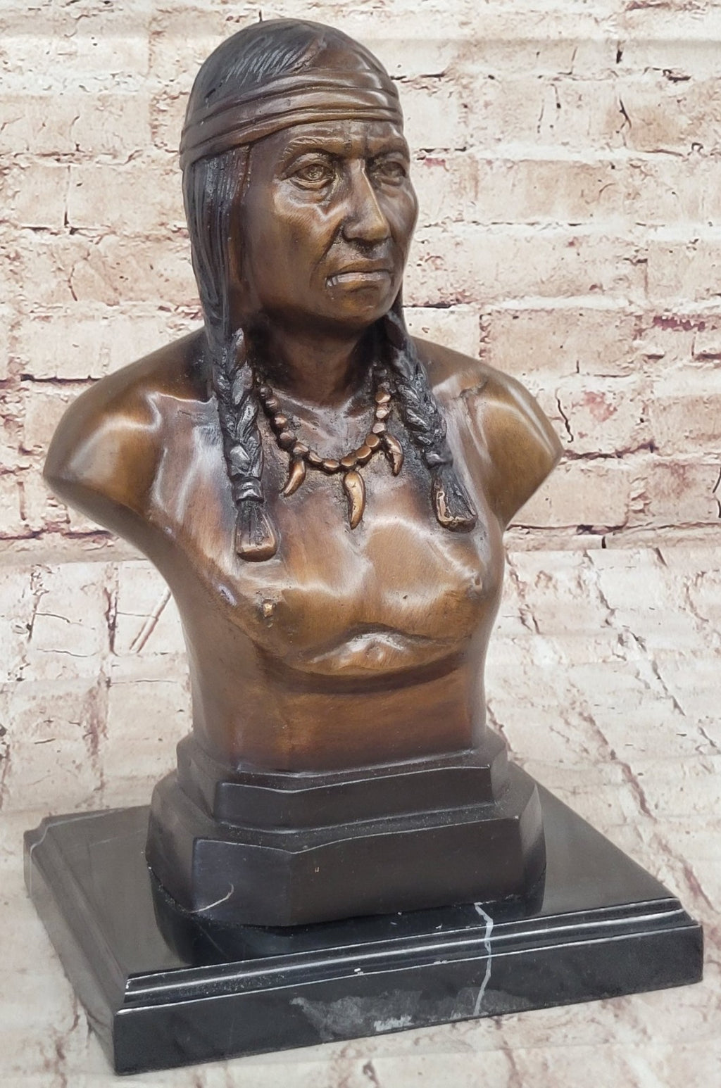 Molded using the archaic method of lost-wax casting, this sculpture achieves a level of detail that brings the warrior chief to life. The skin tones are finished in a brown patina stain, contributing to the overall lifelike appearance and providing a sense of permanence. The bust is skillfully mounted upon a black marble base, creating a visually striking and stable presentation. The signature of C.M. Russell, the artist behind this remarkable piece, adds quality and recognition to the sculpture, showcasing the dedication and expertise involved in its creation.
