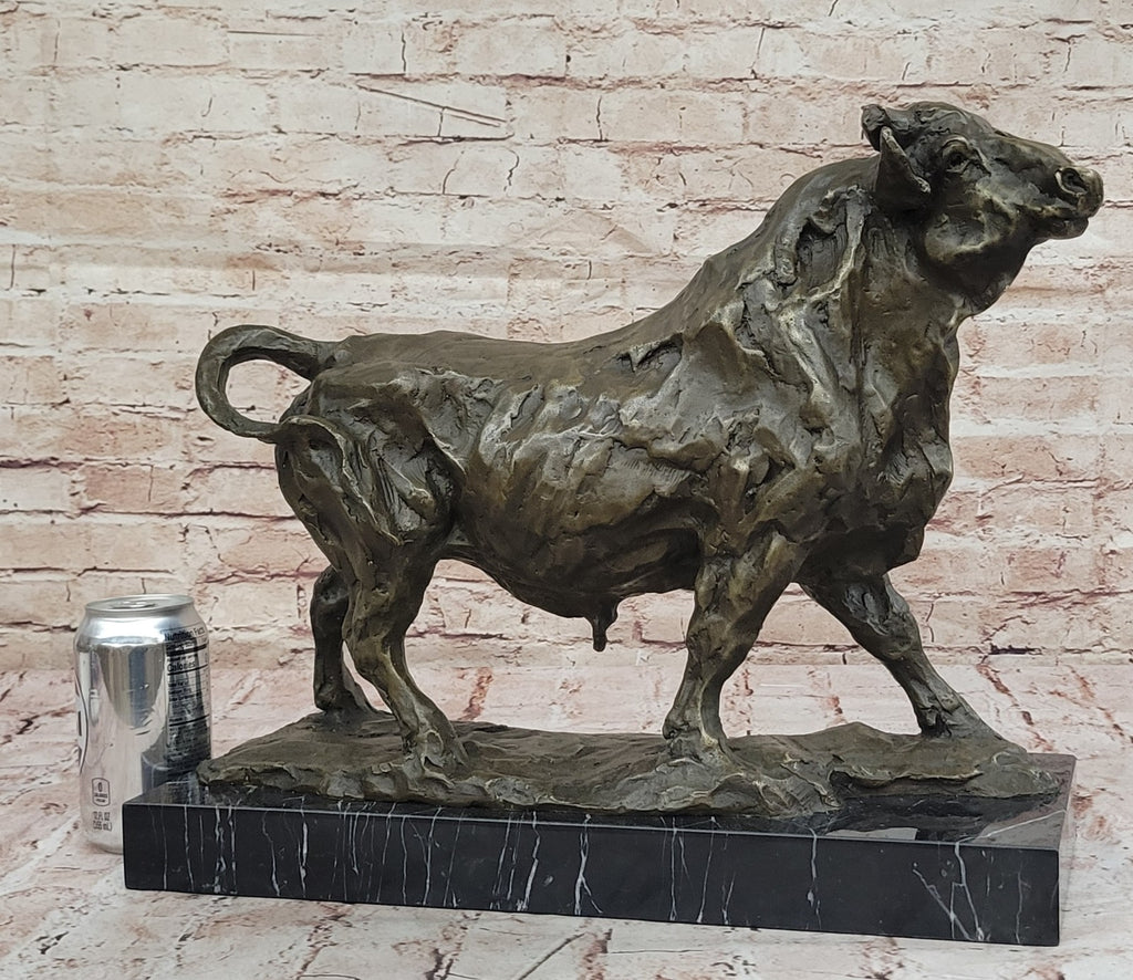 This magnificent bronze sculpture captures the raw power and intensity of a charging bull in action. With his head lowered and nostrils flared, the bull prepares to unleash his strength. His muscles are tensed, and his body vibrates with energy as he stomps the ground in anticipation. Every detail, from the sharpness of his horns to the thick, protective rolls of muscle around his neck, reflects his readiness for battle. He is an embodiment of force and determination, driven by rage, with eyes fixed on his opponent.