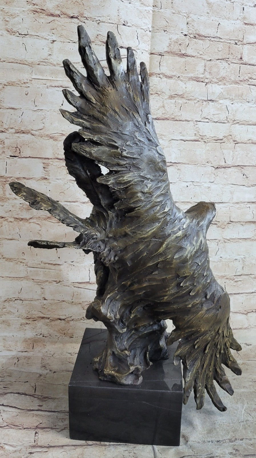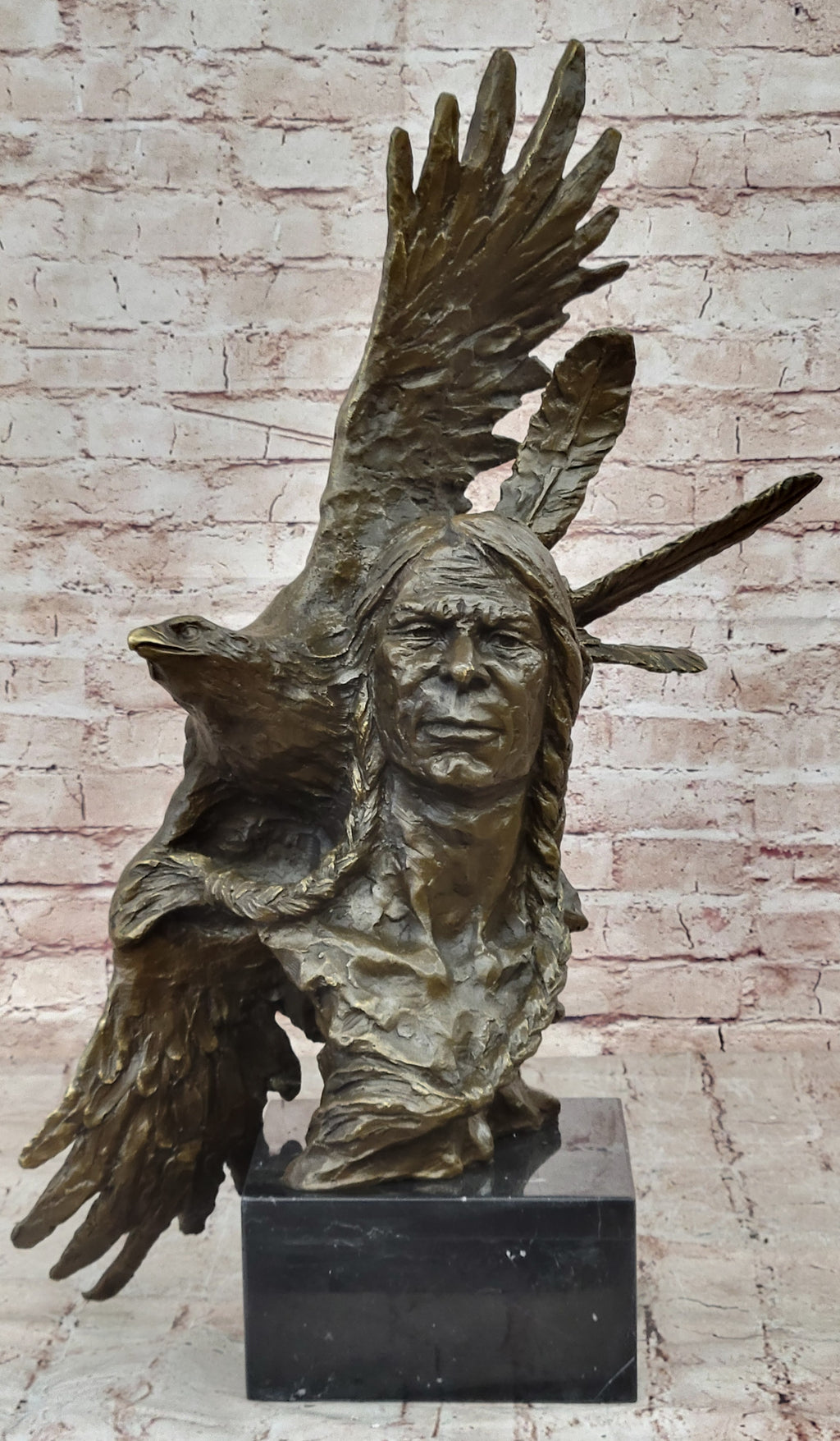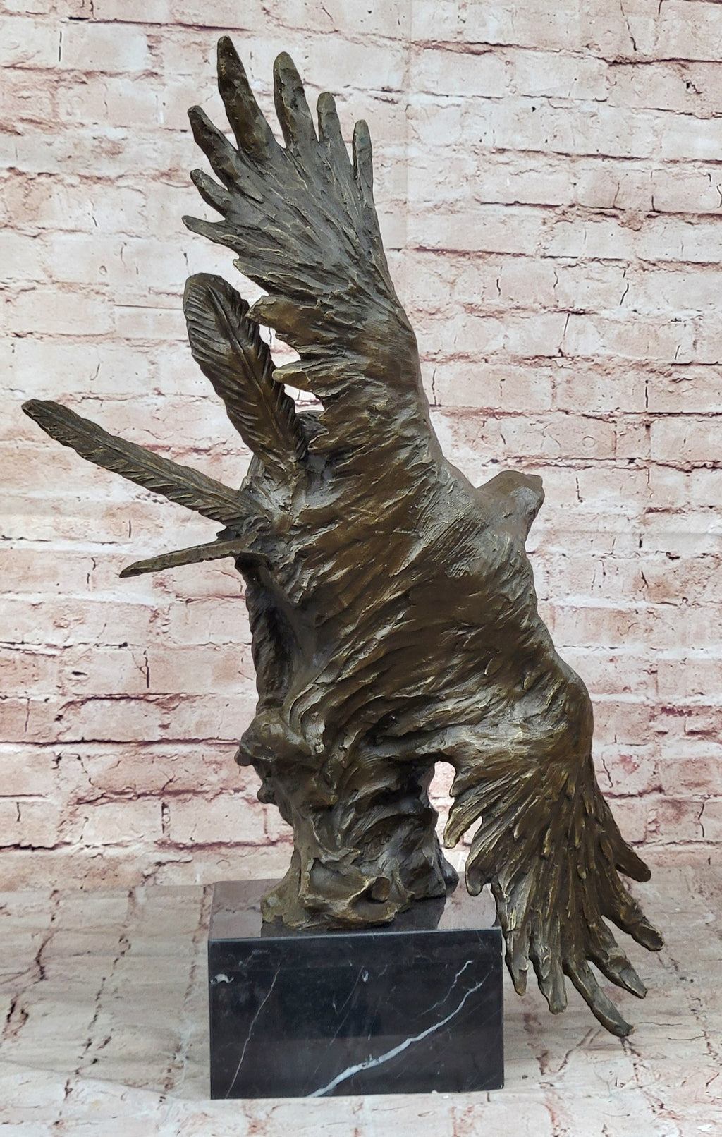 The sculpture's intricate details are a testament to the artist's mastery of the ancient lost-wax casting method, ensuring that every nuance is captured with precision. The rich brown patina finish adds a touch of warmth and depth to the artwork, enhancing its timeless appeal. Resting on a stunning black variegated marble base, this exquisite piece exudes elegance and sophistication, making it a striking addition to any collection or decor.