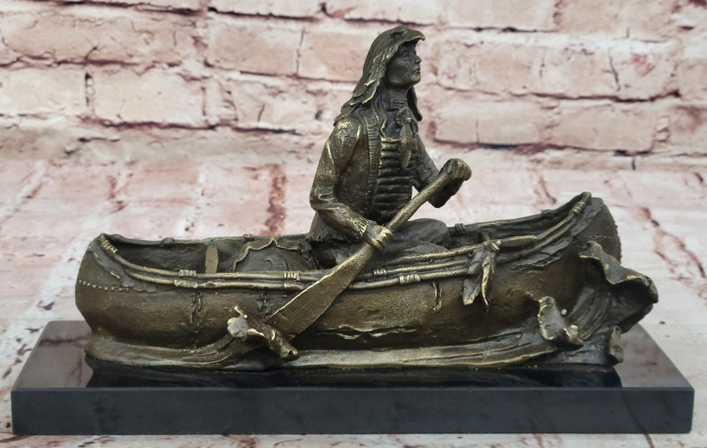 Crafted using the timeless technique of the lost wax method, this sculpture captures every nuanced detail with exceptional precision, bringing to life the essence of the scene. The birchbark canoe's significance is amplified as it carries the Chief, symbolizing his bravery, leadership, and commitment to his tribe's welfare. The Chief's resolute posture and determined gaze speak volumes of his character, as he embarks on this mission to scout nearby enemy territory.