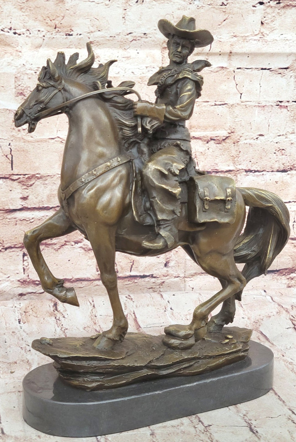 Crafted with meticulous attention to detail using the lost wax method, this sculpture captures the essence of the iconic American Cowboy with stunning realism. From the fluid movement of the horse to the rugged attire of the rider, every aspect is rendered with exquisite precision. The rich brown patina finish enhances the depth and texture of the piece, adding to its visual appeal.