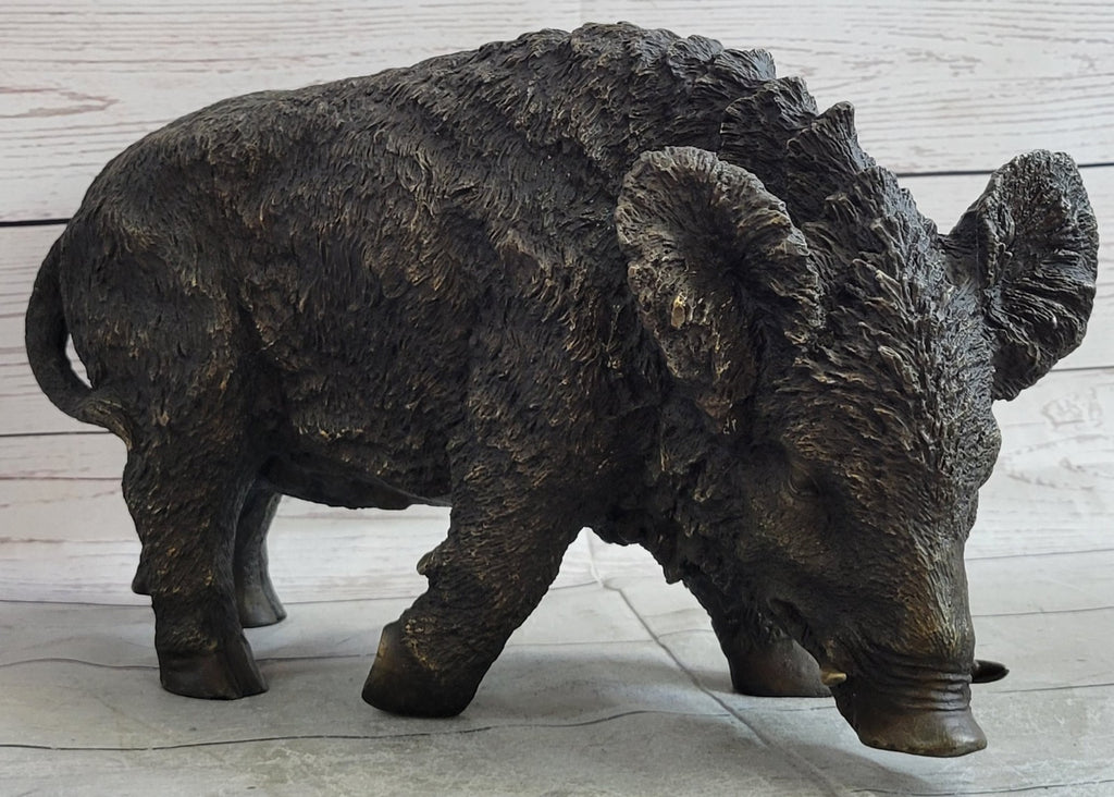 Perfectly suited for display on a desk or mantle, this boar sculpture is not only a remarkable work of art but also a great conversation starter. Its presence evokes a sense of awe and respect for the natural world, making it an ideal addition to any collection or as a distinctive decor piece. Embrace the untamed spirit of the boar with this exquisite bronze sculpture that captures the essence of these magnificent creatures.