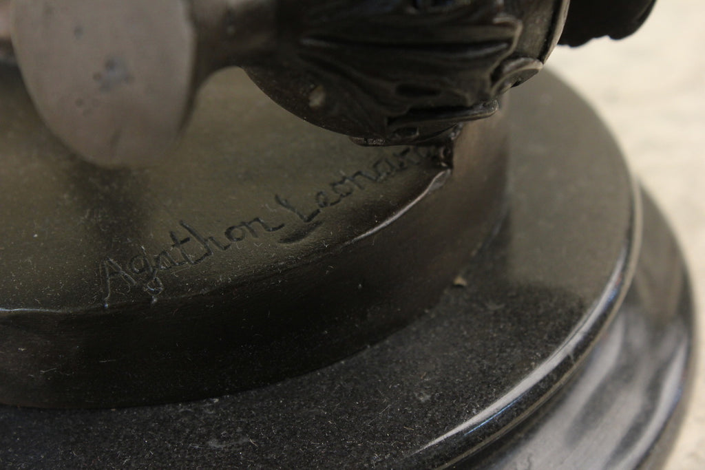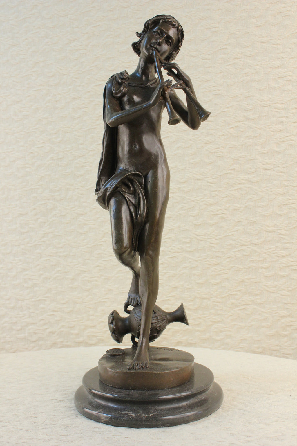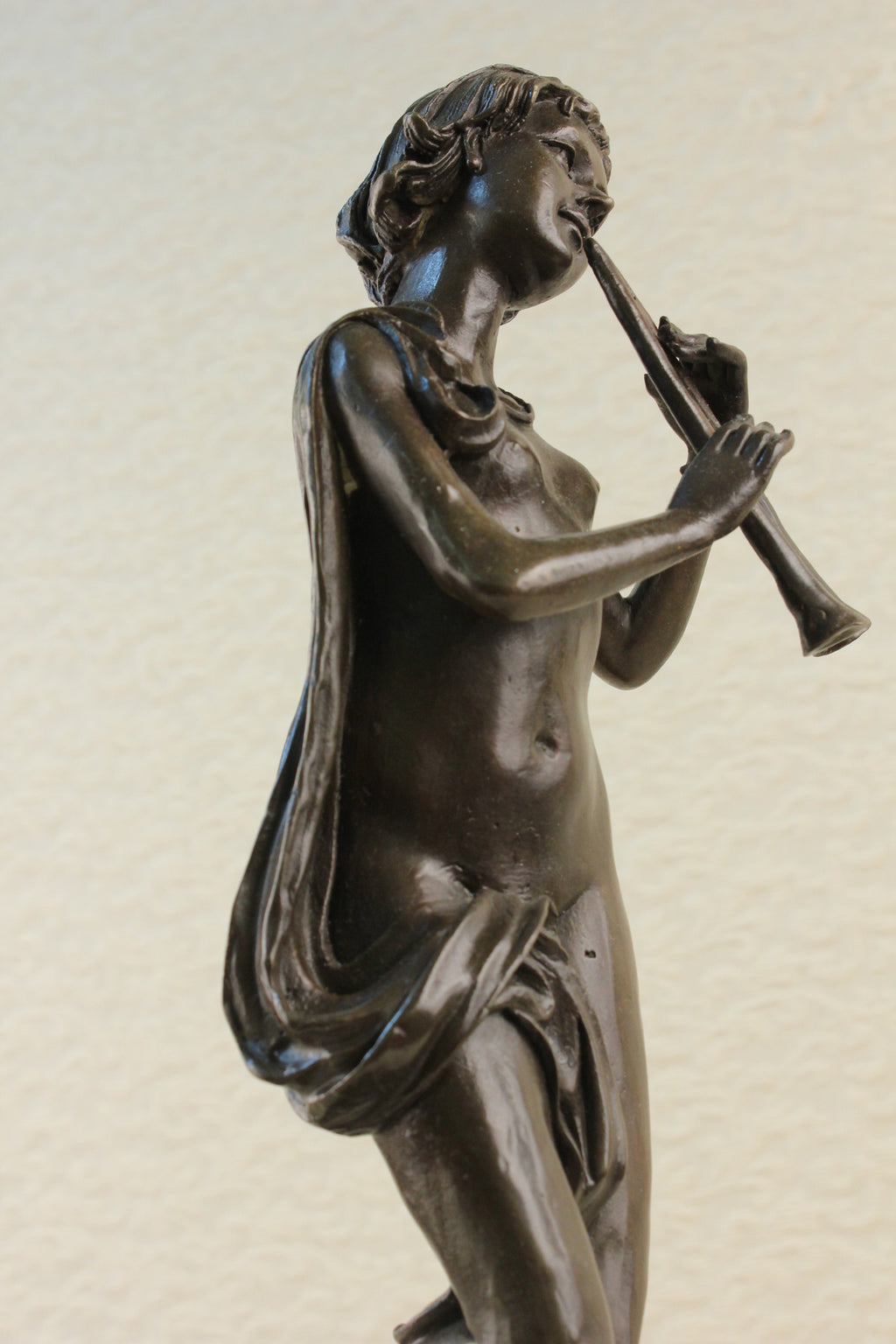 A young woman plays a soothing song on her old fashion trumpet. She puckers her lips around the slender instrument and blows. She shuts her eyes and listens to her melody, confident that she will not hit any sour notes. Her musical notes lift into the air that swirls around her. Her patina goddess scarf hangs loosely over her shoulders and then falls right in between her inner thighs, covering her lower regain except her chest which is exposed. She entertains all who steal a moment to listen to her sweet lullaby. 100% bronze and handmade, this brown patina sculpture was cast using the "Lost Wax Method" and is mounted on a round marble base and is signed Agathan Leonard.