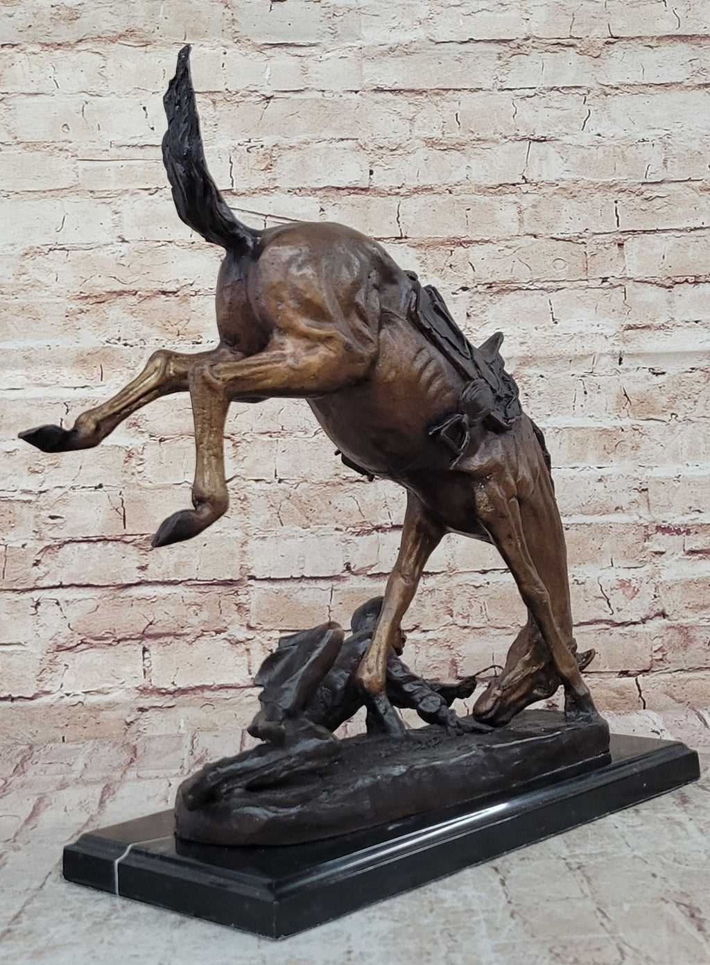 Handcrafted with meticulous attention to detail and fashioned with a rich brown patina, this remarkable sculpture is a stunning embodiment of the artist's mastery and skill, expertly cast using the esteemed "Lost Wax Method." Mounted on a sleek black marble base, the sculpture exudes a sense of timeless strength and enduring perseverance, reflecting the enduring legacy of the frontier era and the enduring resilience of the individuals who braved its challenges. Bearing the signature of the renowned artist Frederic Remington and aptly titled "Wicked Pony," this captivating bronze sculpture serves as a poignant tribute to the indomitable spirit of the American cowboy and the untamed power of the wild West, encapsulating the essence of an era defined by its unyielding determination and unwavering fortitude.