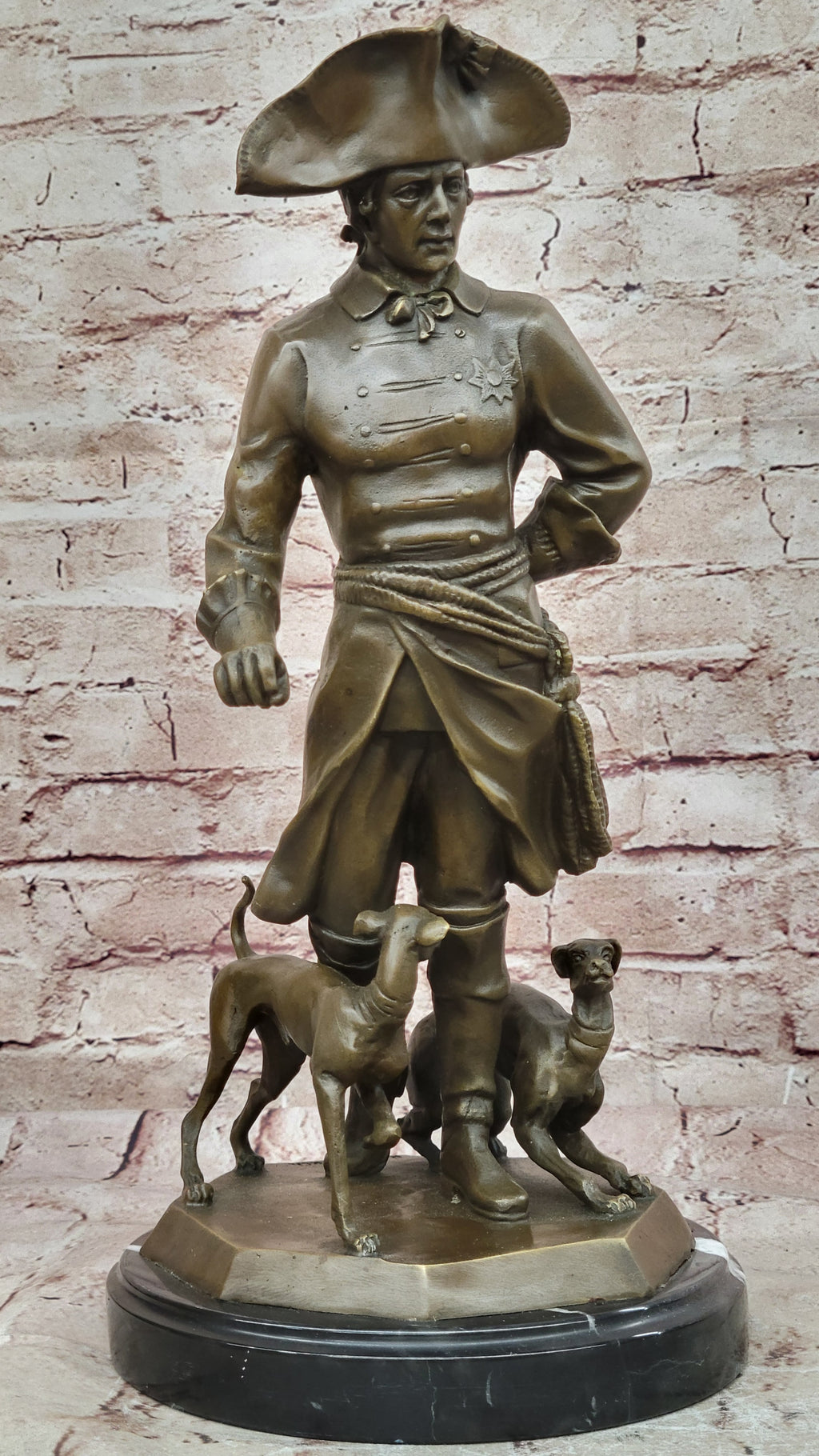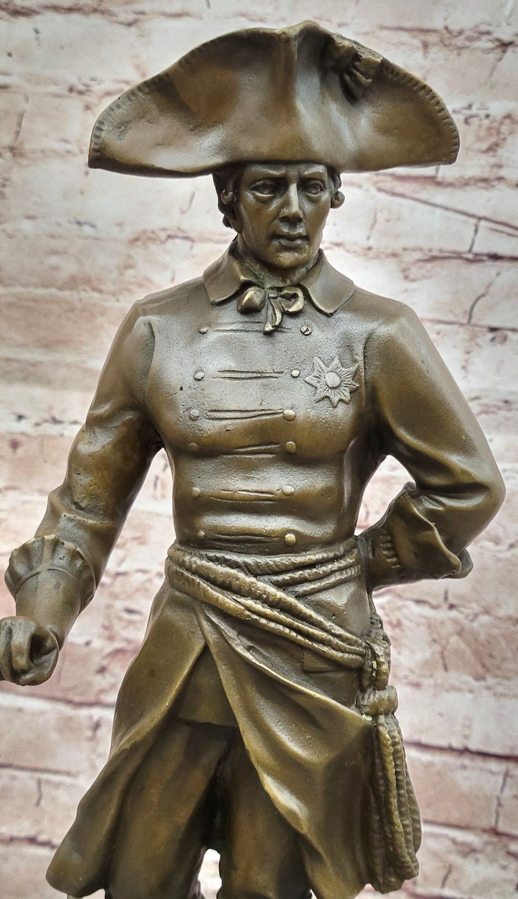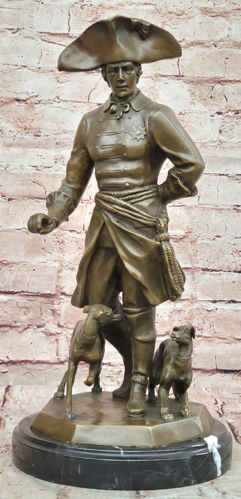 Crafted with meticulous precision using the esteemed lost wax method, this sculpture showcases the artist's dedication to capturing every intricate detail of Frederick the Great's likeness. From the regal expression on his face to the majestic posture, the sculpture exudes a sense of power and authority. Resting on a sleek black marble base, this piece commands attention and becomes a focal point in any setting.