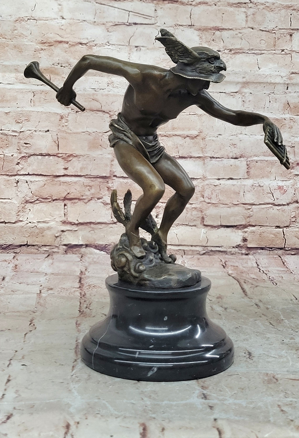 Giambologna became well known for his fine sense of action and movement and a refined, differentiated surface finish. Among his most famous works are the "Mercury" sculptures, of which he created four versions, each capturing the god's dynamic poise. This remarkable bronze piece depicts Mercury, the messenger god, standing on one foot, supported by a zephyr, symbolizing his swiftness. He is depicted wearing a winged petasus on his head and winged sandals, enhancing his speed in flight. In his hand, he carries the caduceus, the staff given to him by Apollo, which has come to symbolize the practice of medicine.